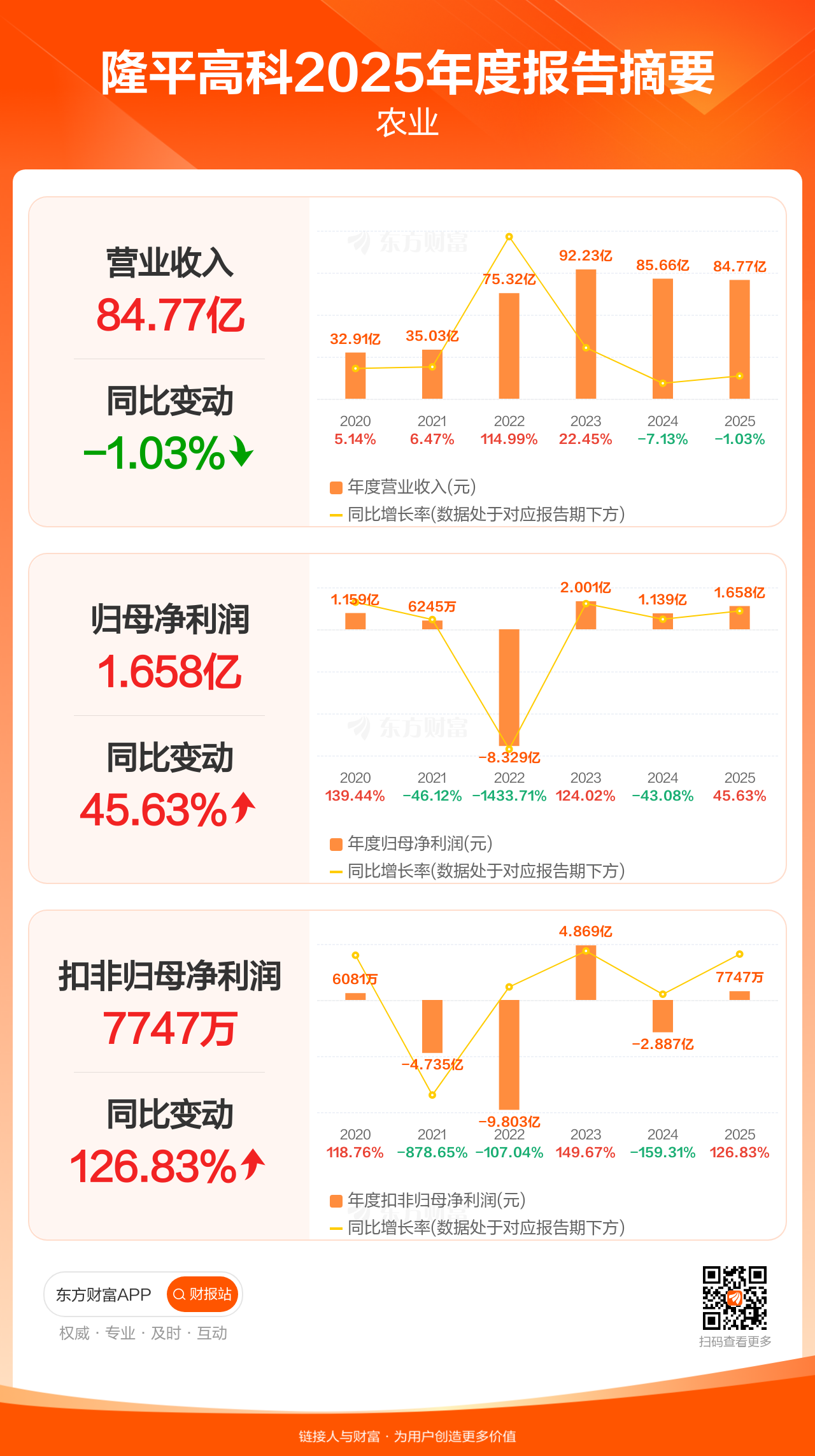 隆平高科4月18日发布2025年年报显示,公司全年实现营业收入84.77亿元,同比下滑1.03%;归母净利润1.66亿元,同比增长45.63%;扣非归母净利润7747.20万元,同比增长126.83%。