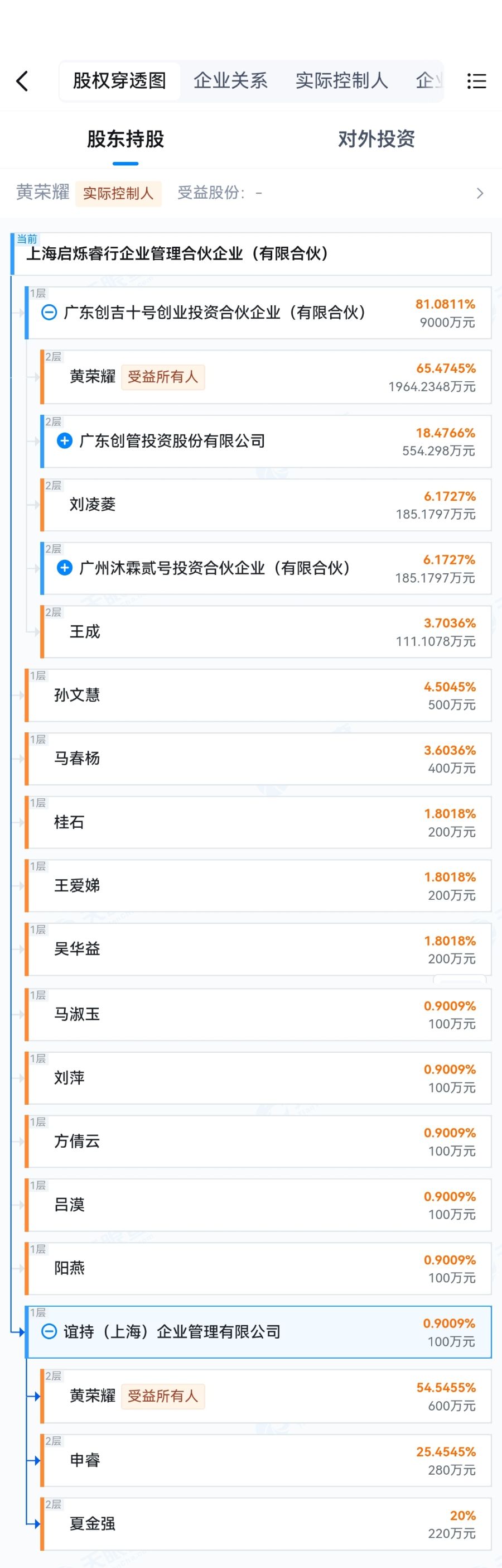 据披露,上海启烁成立于2025年4月23日,是为了本次收购新设的特殊目的主体。其背后是广东创管投资股份有限公司(下称“广东创管投资”),法人代表及受益所有人为黄荣耀。