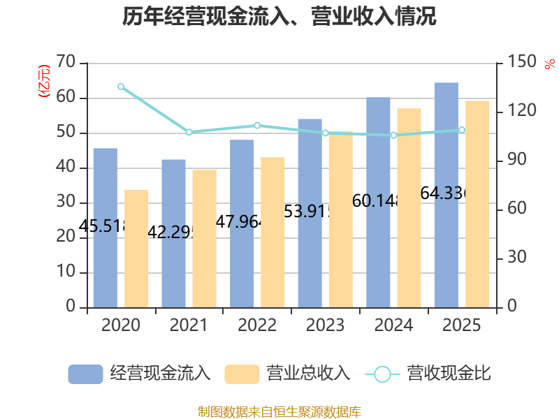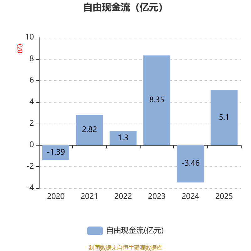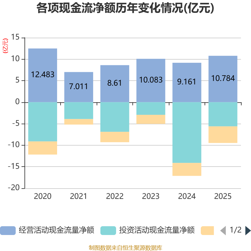 截至2025年,公司经营活动现金流净额为10.78亿元,同比增长17.71%;筹资活动现金流净额-3.86亿元,同比减少8512.72万元;投资活动现金流净额-5.62亿元,上年同期为-14.11亿元。
