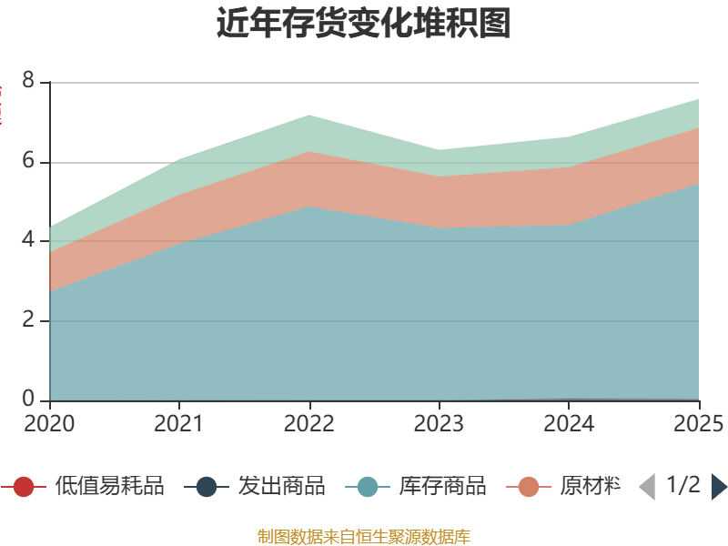 从存货变动来看,截至2025年末,公司存货账面价值为7.57亿元,占净资产的9.39%,较上年末增加9538.96万元。其中,存货跌价准备为2874.86万元,计提比例为3.66%。
