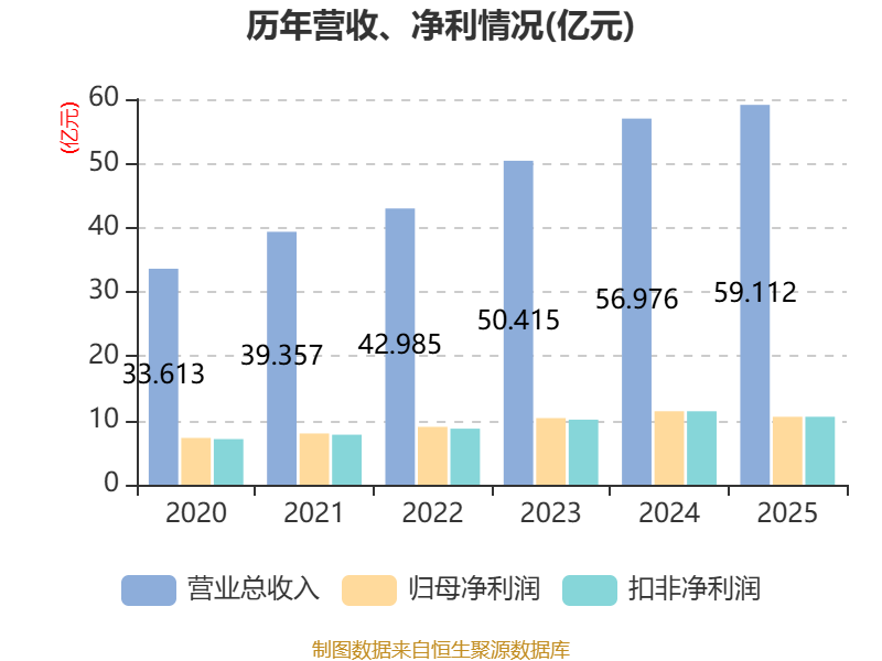 中证智能财讯恩华药业(002262)4月18日披露2025年年度报告。2025年,公司实现营业总收入59.11亿元,同比增长3.75%;归母净利润10.57亿元,同比下降7.54%;扣非净利润10.58亿元,同比下降7.50%;经营活动产生的现金流量净额为10.78亿元,同比增长17.71%;报告期内,恩华药业基本每股收益为1.05元,加权平均净资产收益率为13.88%。公司2025年度分配预案为:拟向全体股东每10股派现4元(含税)。