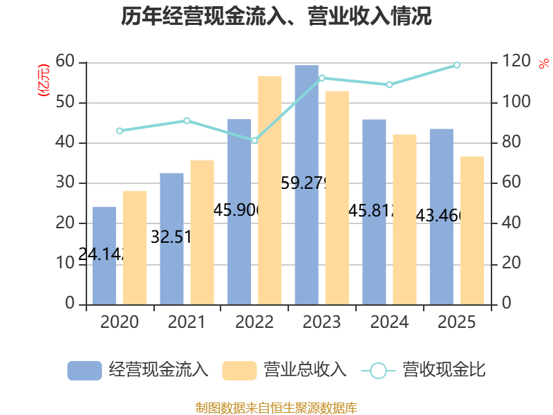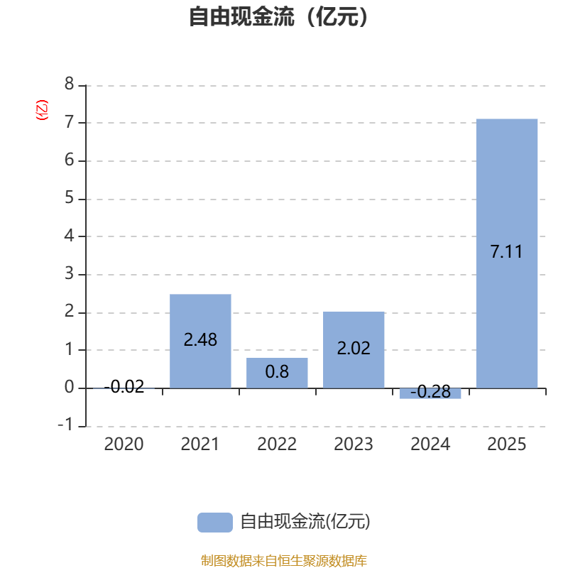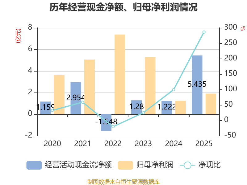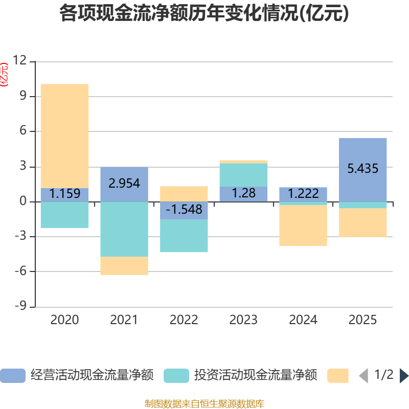 截至2025年,公司经营活动现金流净额为5.43亿元,同比增长344.88%;筹资活动现金流净额-2.46亿元,同比增加1.03亿元;投资活动现金流净额-5841.26万元,上年同期为-3159.93万元。