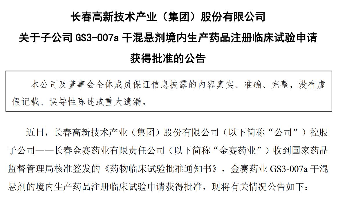 4月16日晚间,国内生长激素龙头长春高新(SZ000661,股价86.62元,市值353.36亿元)公告称,控股子公司长春金赛药业有限责任公司(以下简称“金赛药业”)GS3-007a干混悬剂境内生产药品注册临床试验申请获批准,拟用于特发性身材矮小(ISS)。