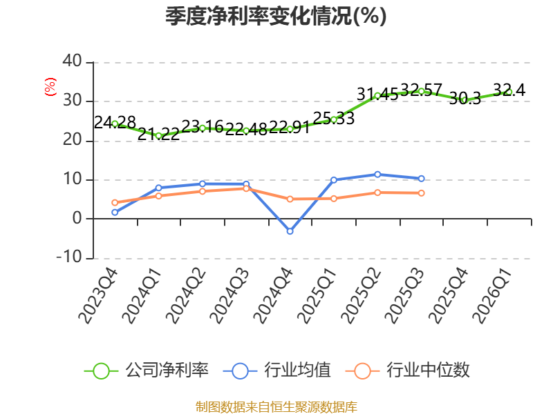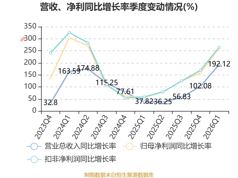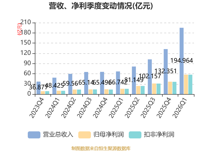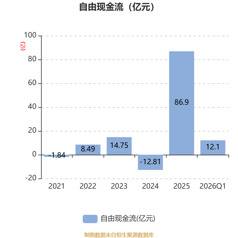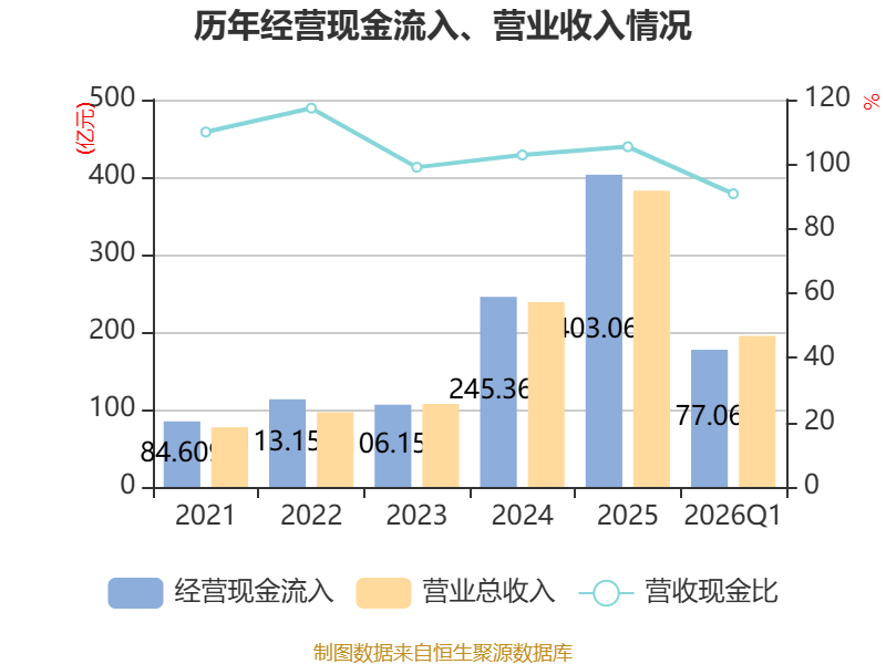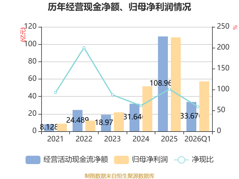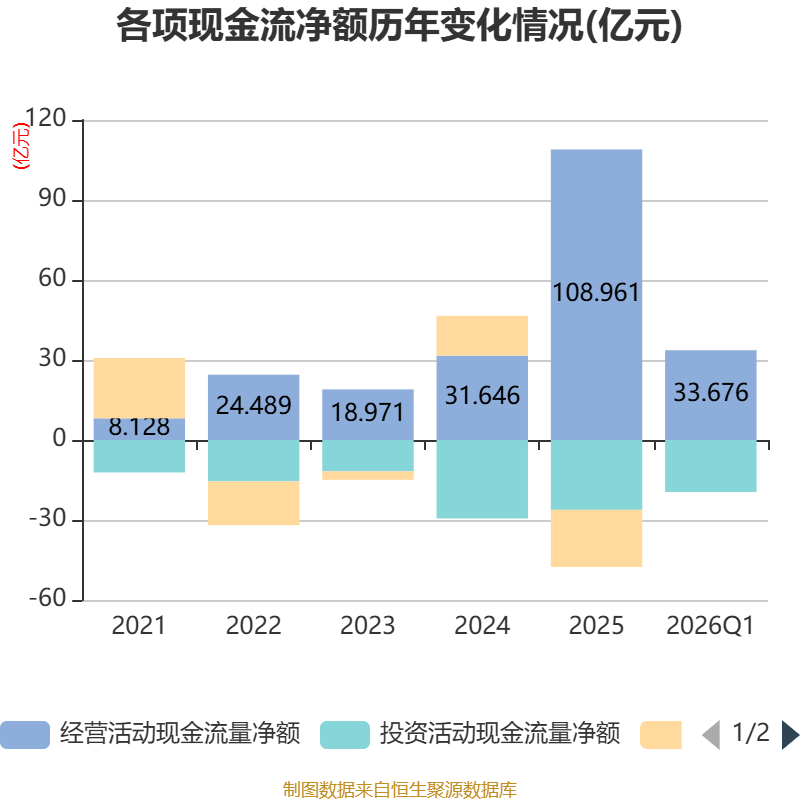 截至2026年一季度末,公司经营活动现金流净额为33.68亿元,同比增长55.58%;筹资活动现金流净额758.76万元,同比减少4730.36万元;投资活动现金流净额-19.48亿元,上年同期为-1.51亿元。