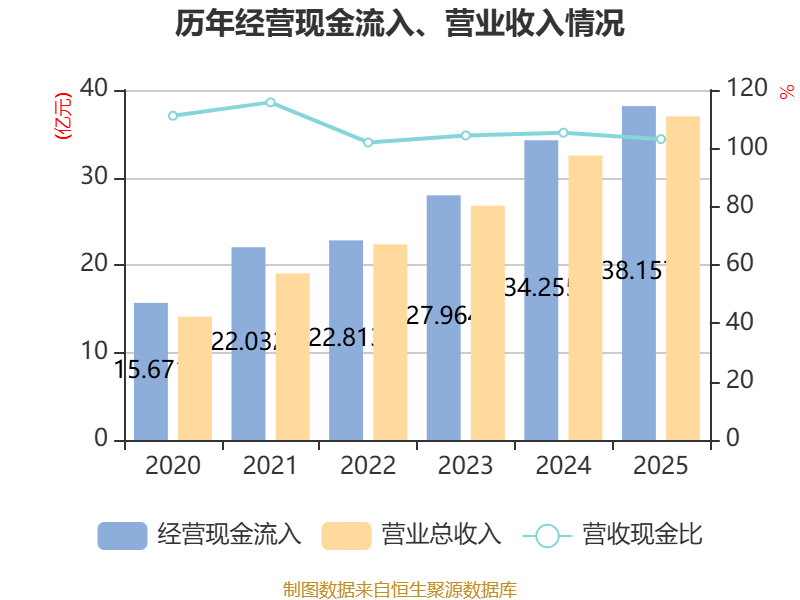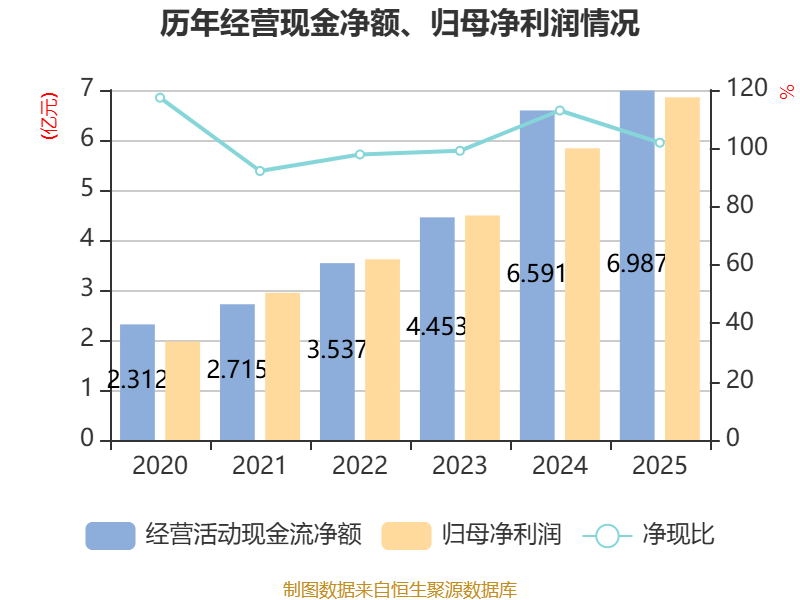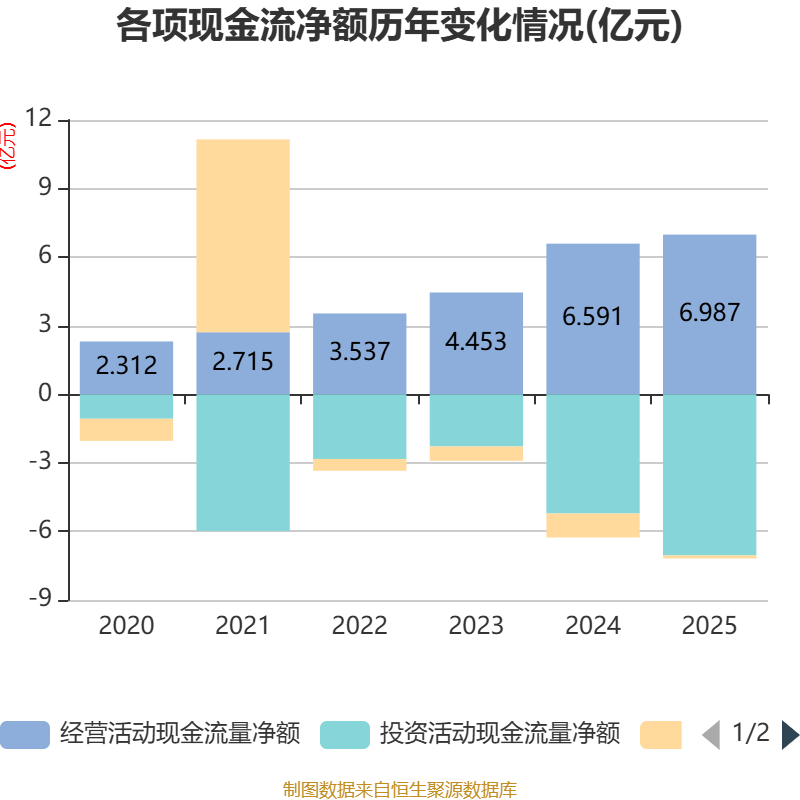 截至2025年,公司经营活动现金流净额为6.99亿元,同比增长6.01%;筹资活动现金流净额-1309.08万元,同比增加9204.21万元;投资活动现金流净额-7.05亿元,上年同期为-5.21亿元。