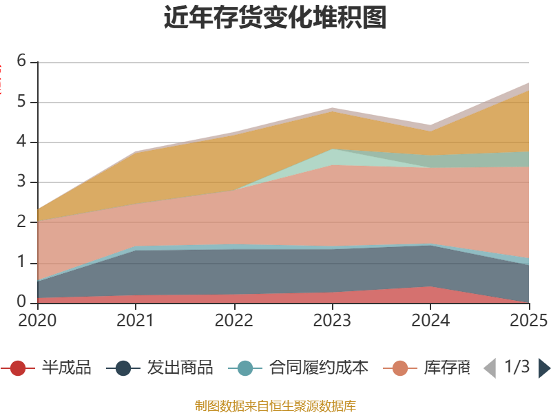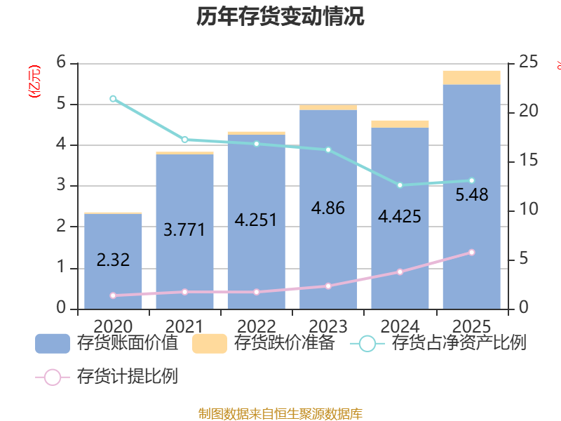 从存货变动来看,截至2025年末,公司存货账面价值为5.48亿元,占净资产的13.05%,较上年末增加1.05亿元。其中,存货跌价准备为3338.56万元,计提比例为5.74%。
