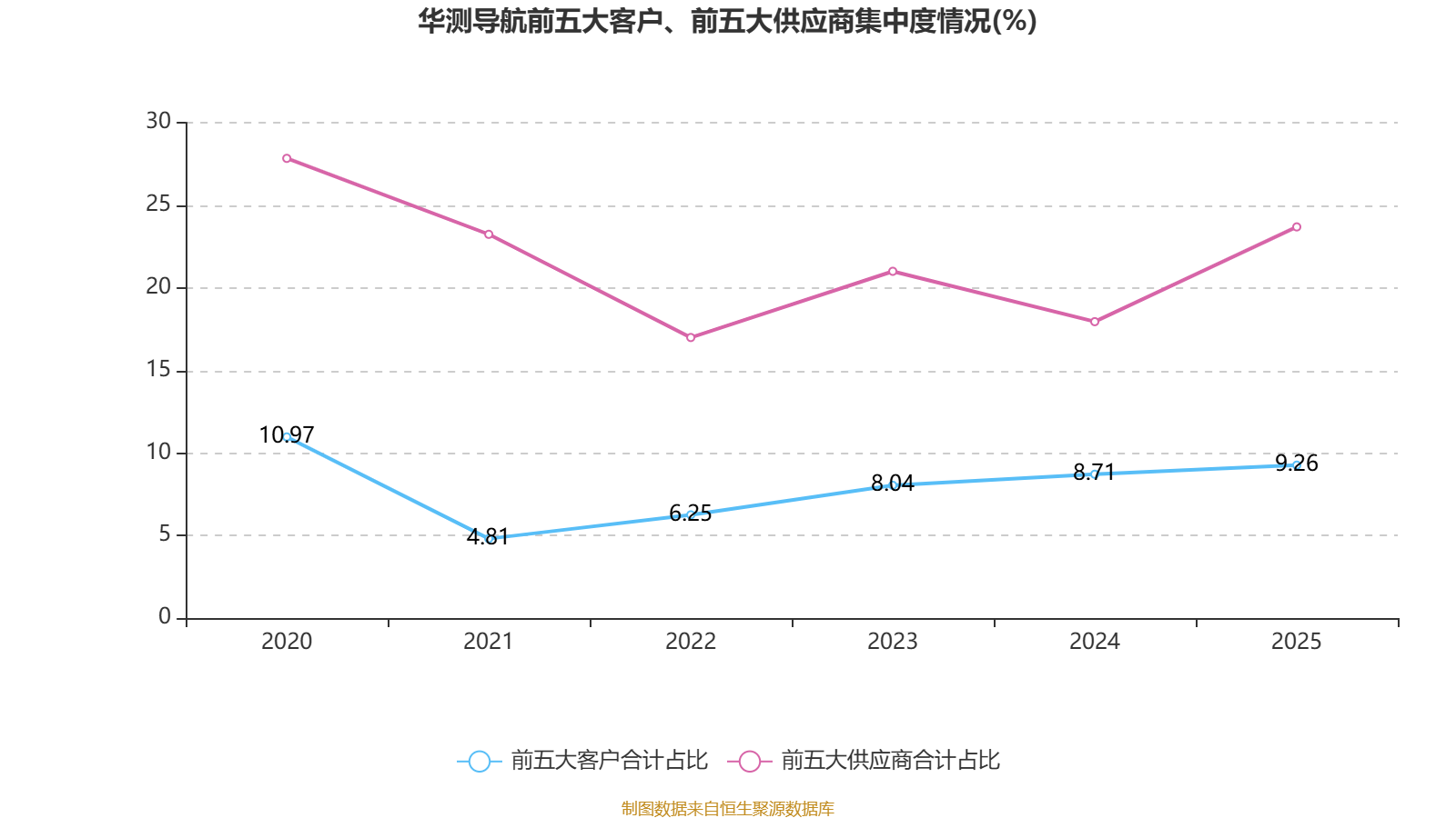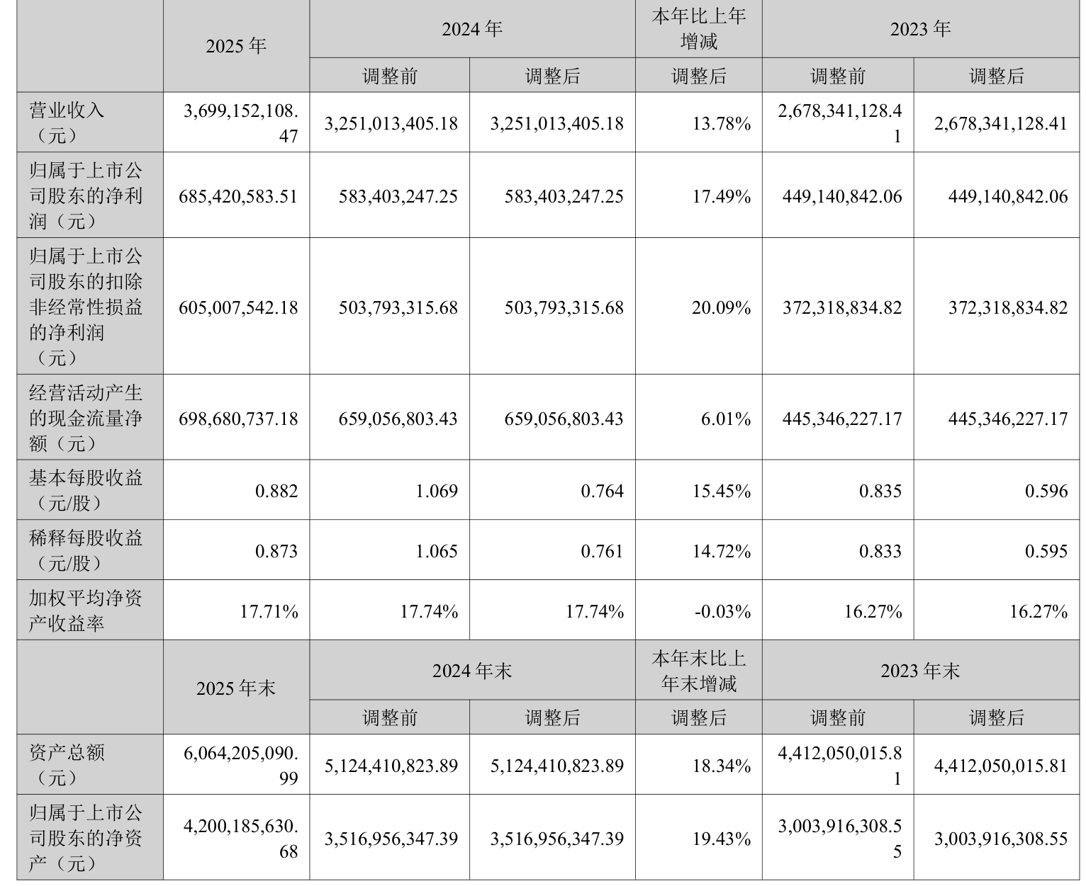 中证智能财讯华测导航(300627)4月17日披露2025年年度报告。2025年,公司实现营业总收入36.99亿元,同比增长13.78%;归母净利润6.85亿元,同比增长17.49%;扣非净利润6.05亿元,同比增长20.09%;经营活动产生的现金流量净额为6.99亿元,同比增长6.01%;报告期内,华测导航基本每股收益为0.882元,加权平均净资产收益率为17.71%。公司2025年度分配预案为:拟向全体股东每10股派现4.5元(含税)。