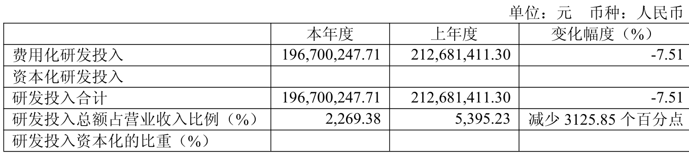 2025年全年,公司研发投入金额为1.97亿元,同比下降7.51%;研发投入占营业收入比例为2269.38%,相比上年同期下降3125.85个百分点。