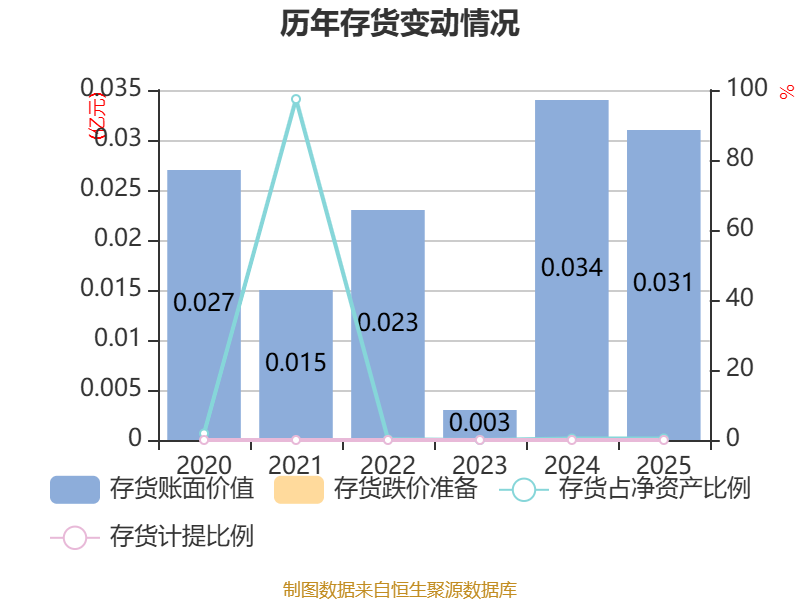 从存货变动来看,截至2025年末,公司存货账面价值为308.1万元,占净资产的0.45%,较上年末减少32.96万元。公司本期没有计提存货跌价准备。