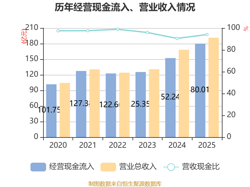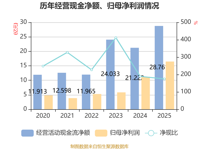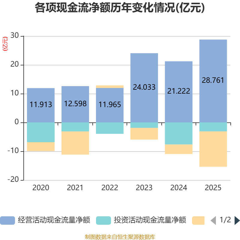 截至2025年,公司经营活动现金流净额为28.76亿元,同比增长35.53%;筹资活动现金流净额-12.28亿元,同比减少8.97亿元;投资活动现金流净额-3.12亿元,上年同期为-7.67亿元。