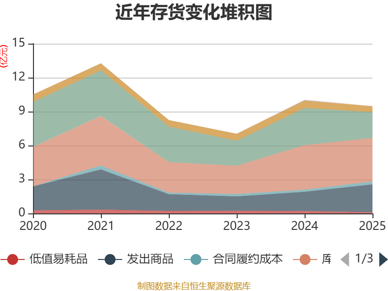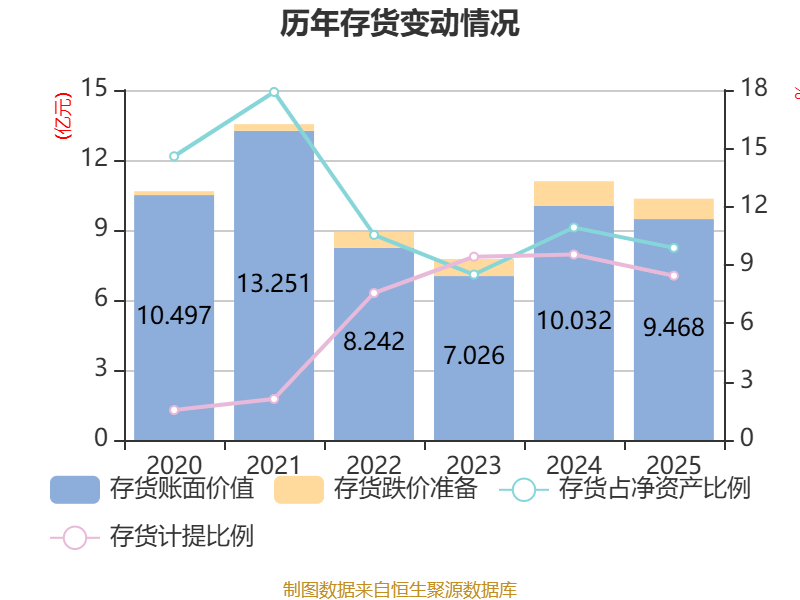 从存货变动来看,截至2025年末,公司存货账面价值为9.47亿元,占净资产的9.88%,较上年末减少5637.91万元。其中,存货跌价准备为8740.34万元,计提比例为8.45%。