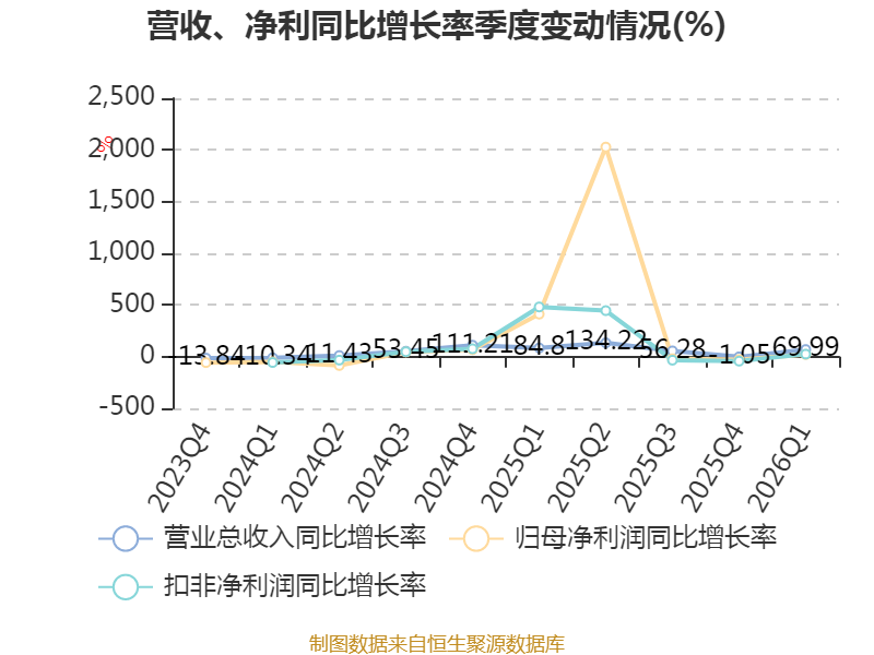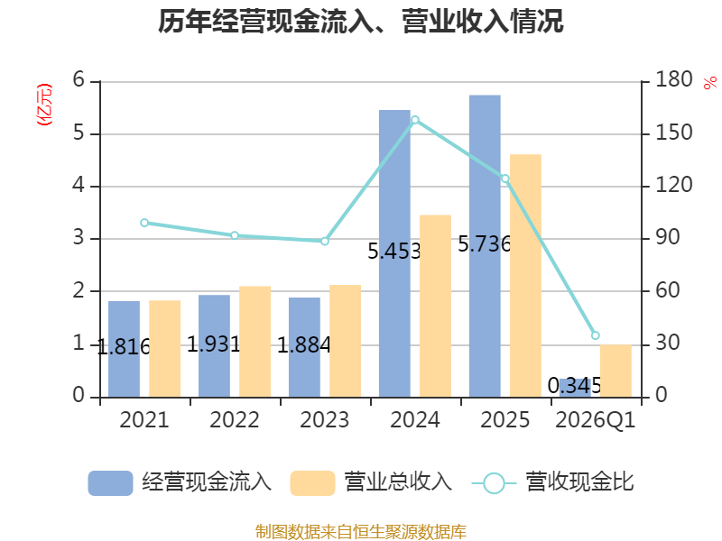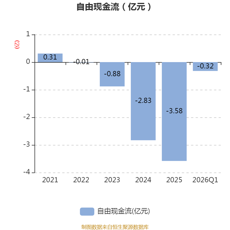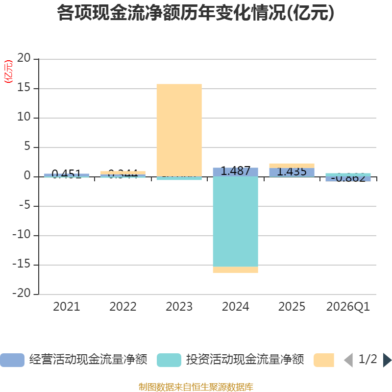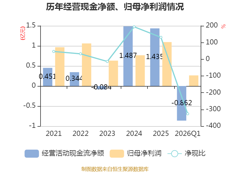 截至2026年一季度末,公司经营活动现金流净额为-8619.19万元,同比减少5674.53万元;筹资活动现金流净额-50.85万元,同比增加33.24万元;投资活动现金流净额5398.93万元,上年同期为-5652.52万元。