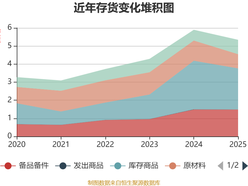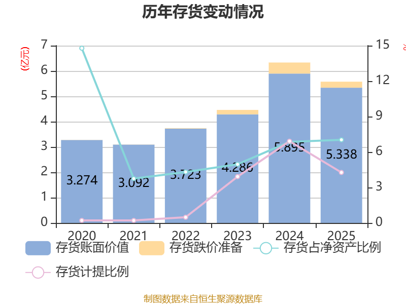 从存货变动来看,截至2025年末,公司存货账面价值为5.34亿元,占净资产的7.03%,较上年末减少5568.13万元。其中,存货跌价准备为2379.26万元,计提比例为4.27%。