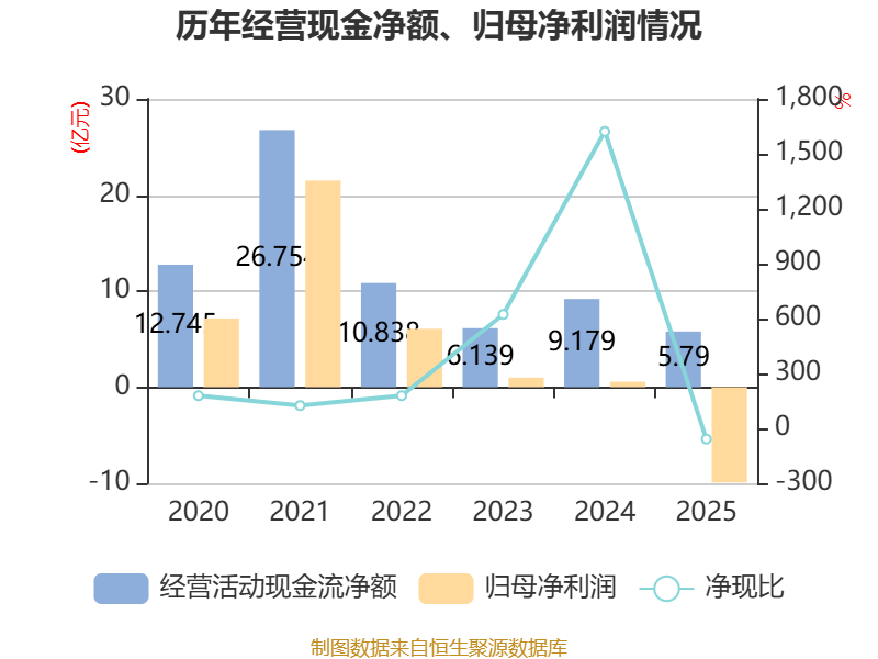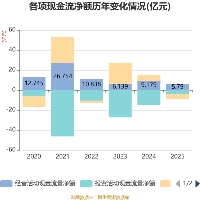 截至2025年,公司经营活动现金流净额为5.79亿元,同比下降36.92%;筹资活动现金流净额-4.79亿元,同比减少10.83亿元;投资活动现金流净额-4.15亿元,上年同期为-14.89亿元。