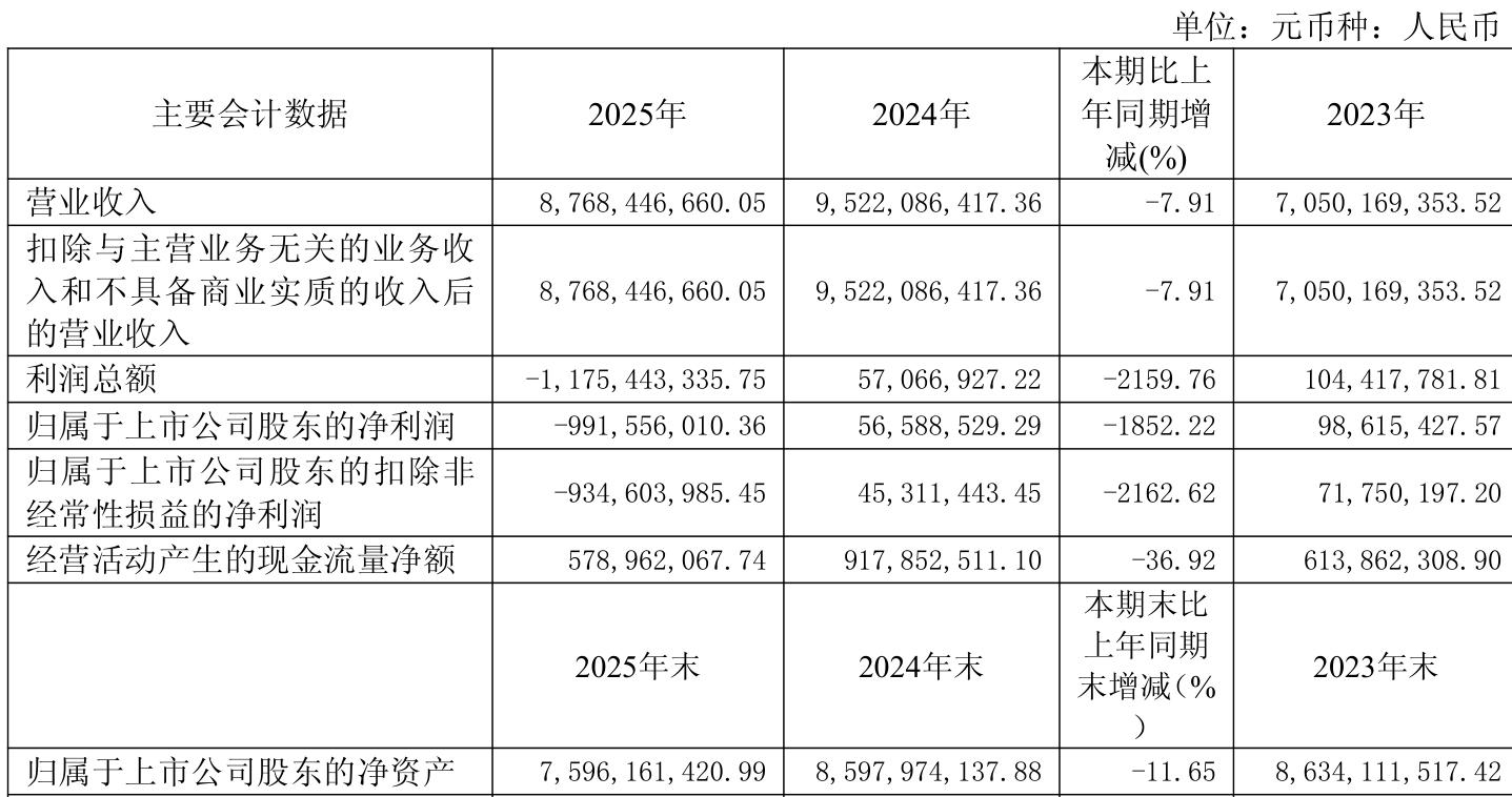 中证智能财讯维远股份(600955)4月18日披露2025年年度报告。2025年,公司实现营业总收入87.68亿元,同比下降7.91%;归母净利润亏损9.92亿元,上年同期盈利5658.85万元;扣非净利润亏损9.35亿元,上年同期盈利4531.14万元;经营活动产生的现金流量净额为5.79亿元,同比下降36.92%;报告期内,维远股份基本每股收益为-1.81元,加权平均净资产收益率为-12.25%。公司2025年度分配预案为:拟向全体股东每10股派现0.5元(含税)。