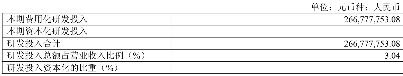 2025年全年,公司研发投入金额为2.67亿元,同比下降14.56%;研发投入占营业收入比例为3.04%,相比上年同期下降0.24个百分点。此外,公司全年研发投入资本化率为0%。