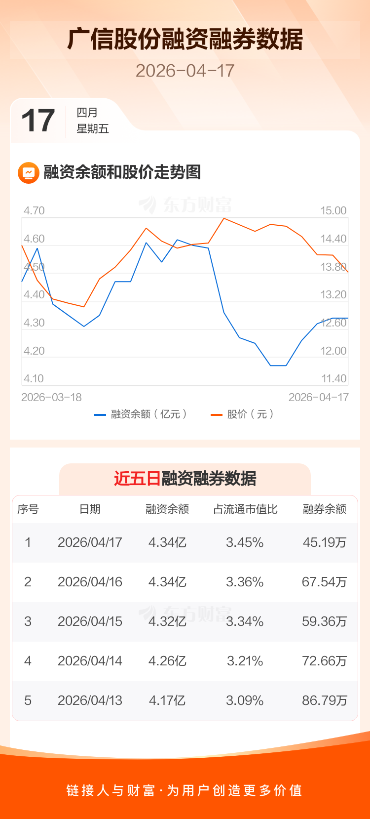 交易所最新数据显示,广信股份于2026年4月17日获融资买入1229.84万元,融资偿还1181.80万元,当日融资净买入48.03万元。目前,该股融资余额4.34亿,占流通市值比例为3.45%。