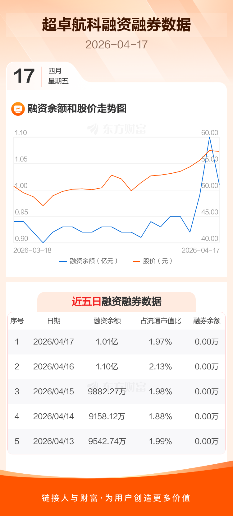 交易所最新数据显示,超卓航科于2026年4月17日获融资买入578.47万元,融资偿还1456.98万元,当日融资净偿还878.51万元。目前,该股融资余额1.01亿,占流通市值比例为1.97%。