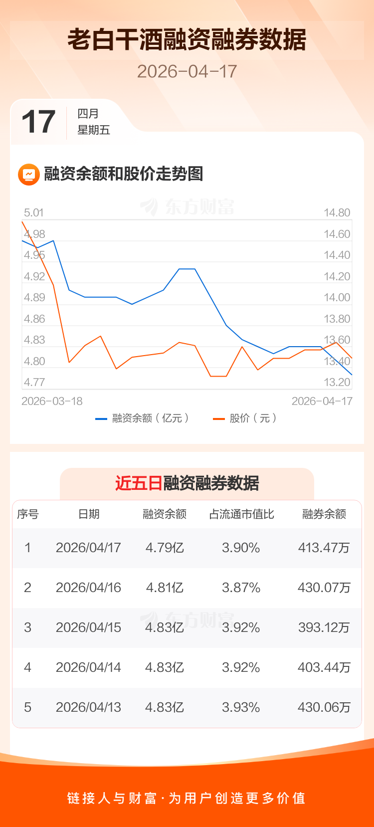 交易所最新数据显示,老白干酒于2026年4月17日获融资买入480.70万元,融资偿还642.76万元,当日融资净偿还162.07万元。目前,该股融资余额4.79亿,占流通市值比例为3.90%。