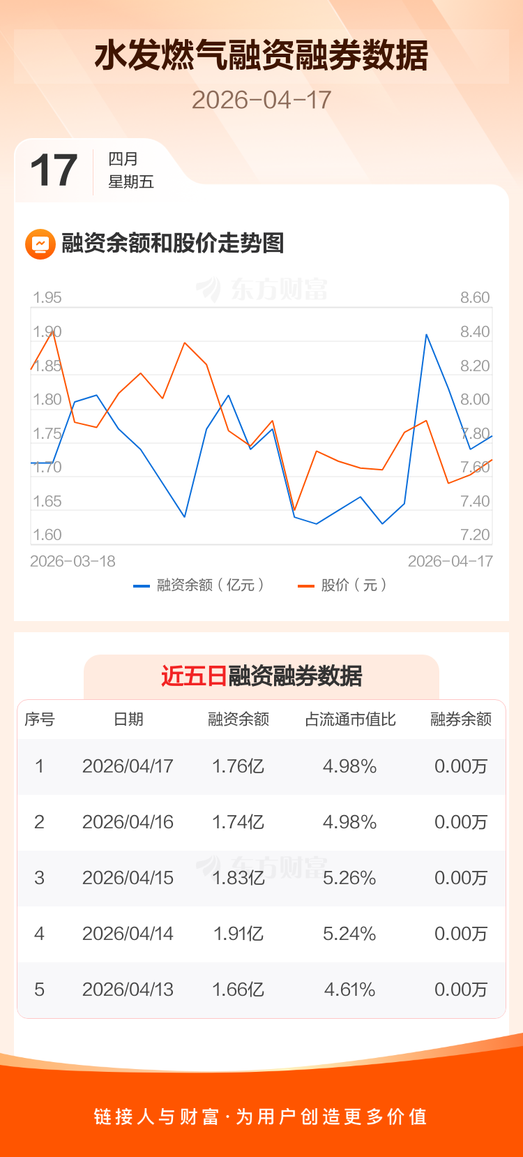 交易所最新数据显示,水发燃气于2026年4月17日获融资买入1593.42万元,融资偿还1400.79万元,当日融资净买入192.63万元。目前,该股融资余额1.76亿,占流通市值比例为4.98%。