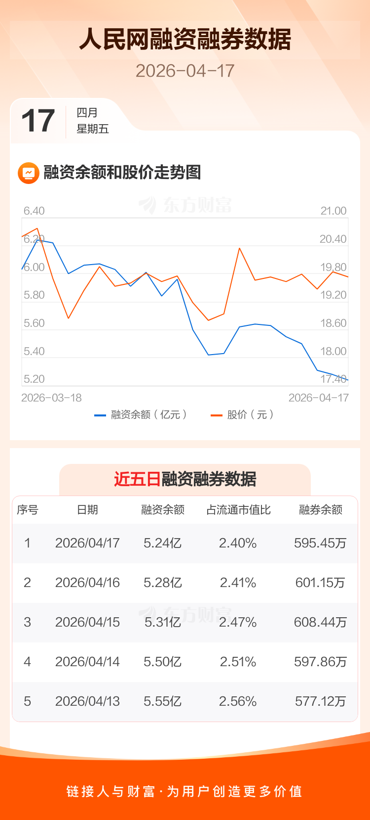 交易所最新数据显示,人民网于2026年4月17日获融资买入2461.11万元,融资偿还2878.30万元,当日融资净偿还417.19万元。目前,该股融资余额5.24亿,占流通市值比例为2.40%。