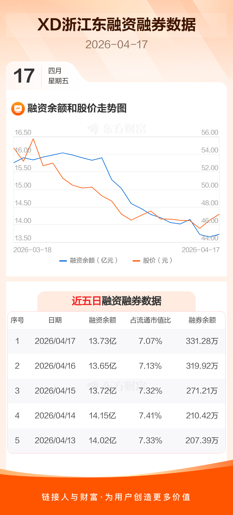 交易所最新数据显示,XD浙江东于2026年4月17日获融资买入2360.44万元,融资偿还1535.50万元,当日融资净买入824.94万元。目前,该股融资余额13.73亿,占流通市值比例为7.07%。