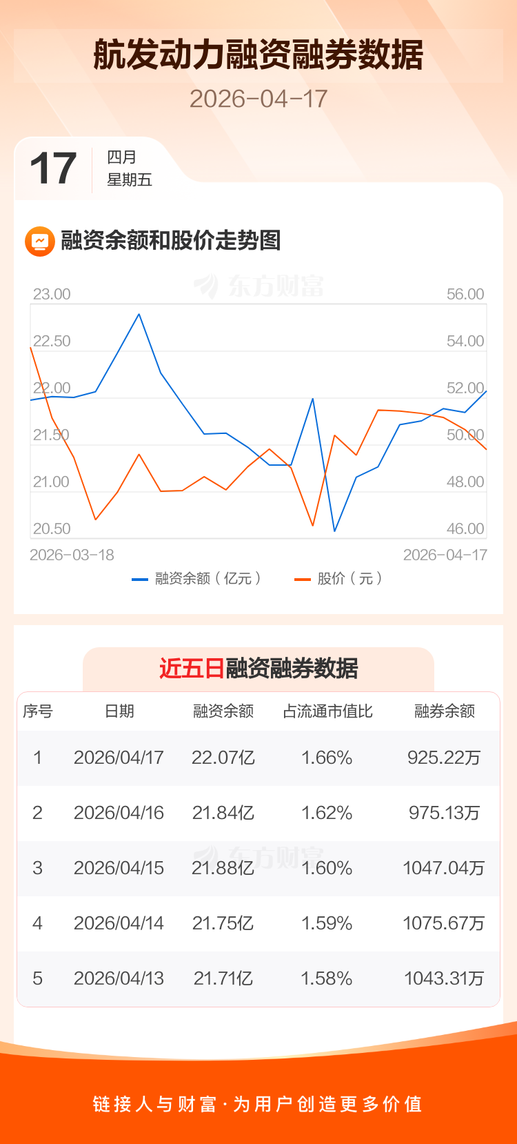 交易所最新数据显示,航发动力于2026年4月17日获融资买入1.47亿元,融资偿还1.23亿元,当日融资净买入2376.57万元。目前,该股融资余额22.07亿,占流通市值比例为1.66%。