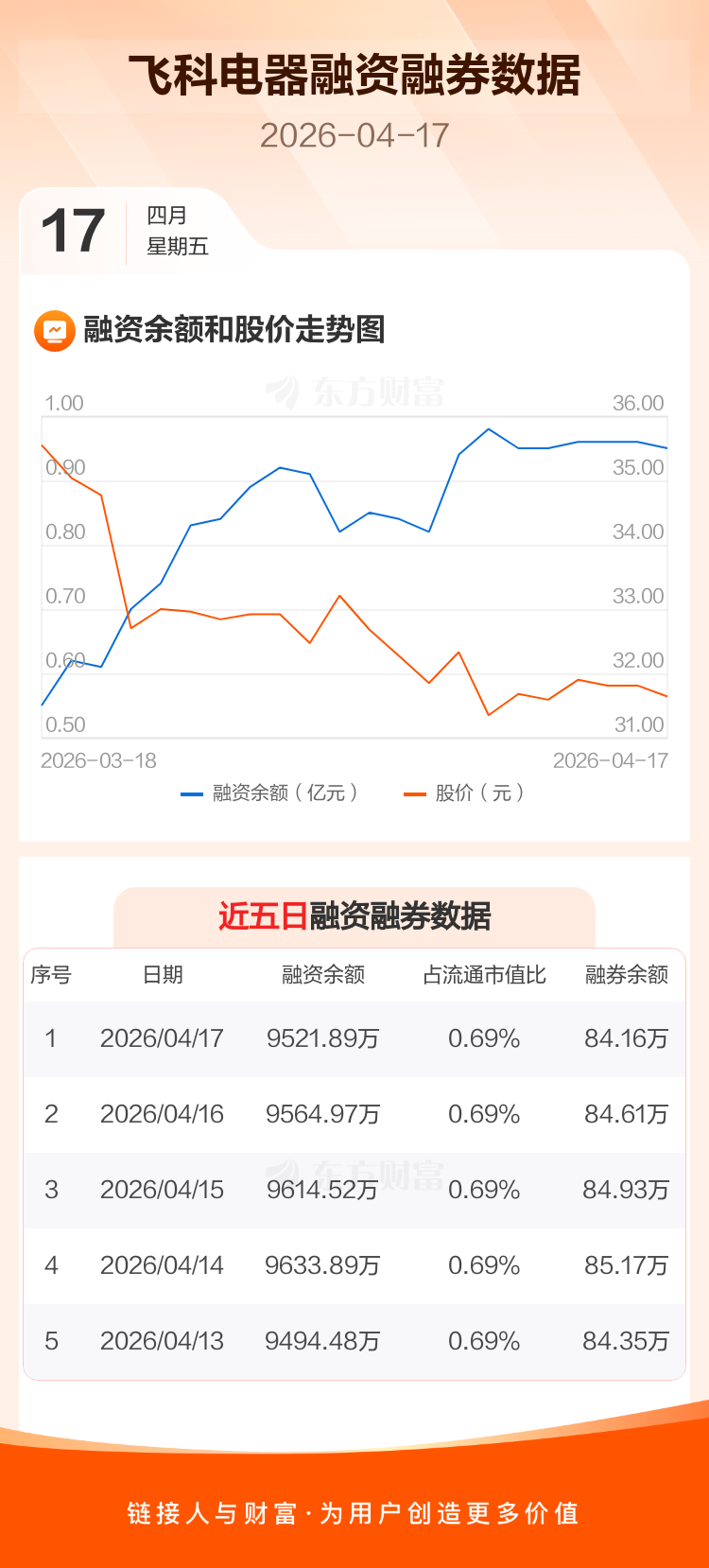 交易所最新数据显示,飞科电器于2026年4月17日获融资买入362.79万元,融资偿还405.87万元,当日融资净偿还43.08万元。目前,该股融资余额9521.89万,占流通市值比例为0.69%。