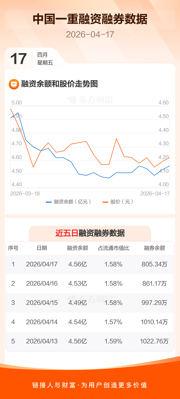 交易所最新数据显示,中国一重于2026年4月17日获融资买入1717.30万元,融资偿还1415.47万元,当日融资净买入301.83万元。目前,该股融资余额4.56亿,占流通市值比例为1.58%。