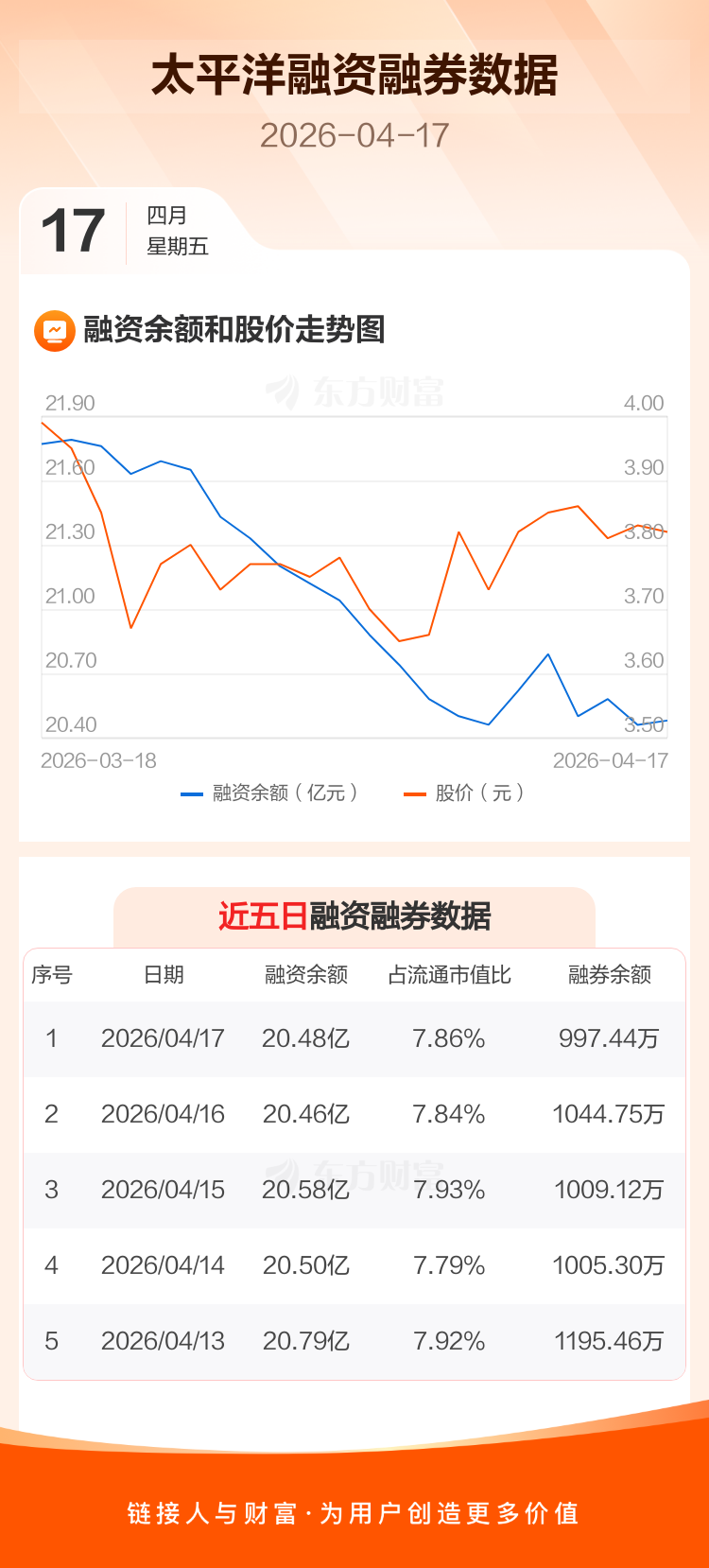 交易所最新数据显示,太平洋于2026年4月17日获融资买入4839.77万元,融资偿还4685.20万元,当日融资净买入154.57万元。目前,该股融资余额20.48亿,占流通市值比例为7.86%。