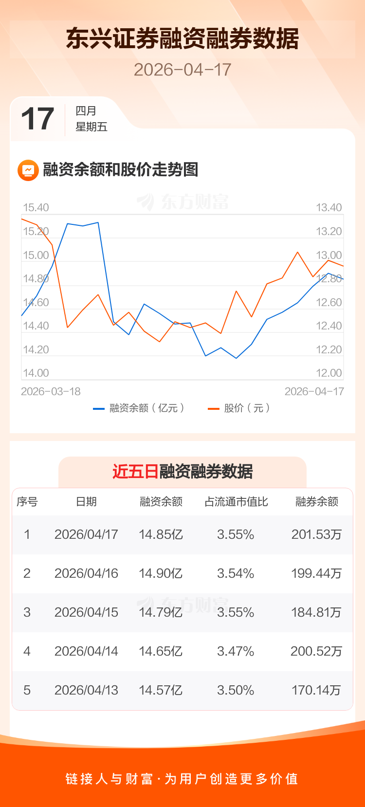 交易所最新数据显示,东兴证券于2026年4月17日获融资买入1824.22万元,融资偿还2329.88万元,当日融资净偿还505.66万元。目前,该股融资余额14.85亿,占流通市值比例为3.55%。