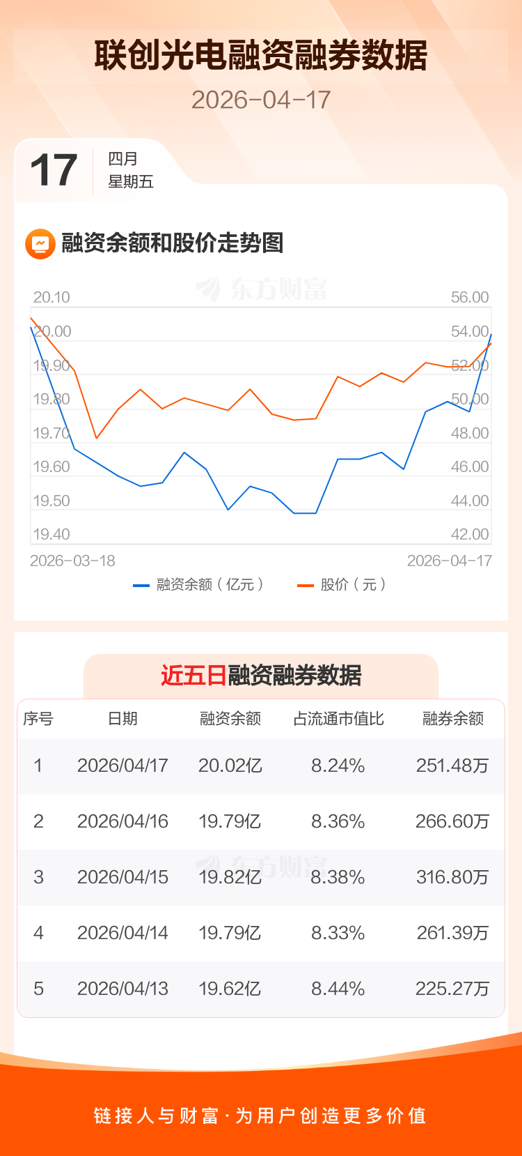 交易所最新数据显示,联创光电于2026年4月17日获融资买入7963.73万元,融资偿还5695.68万元,当日融资净买入2268.04万元。目前,该股融资余额20.02亿,占流通市值比例为8.24%。