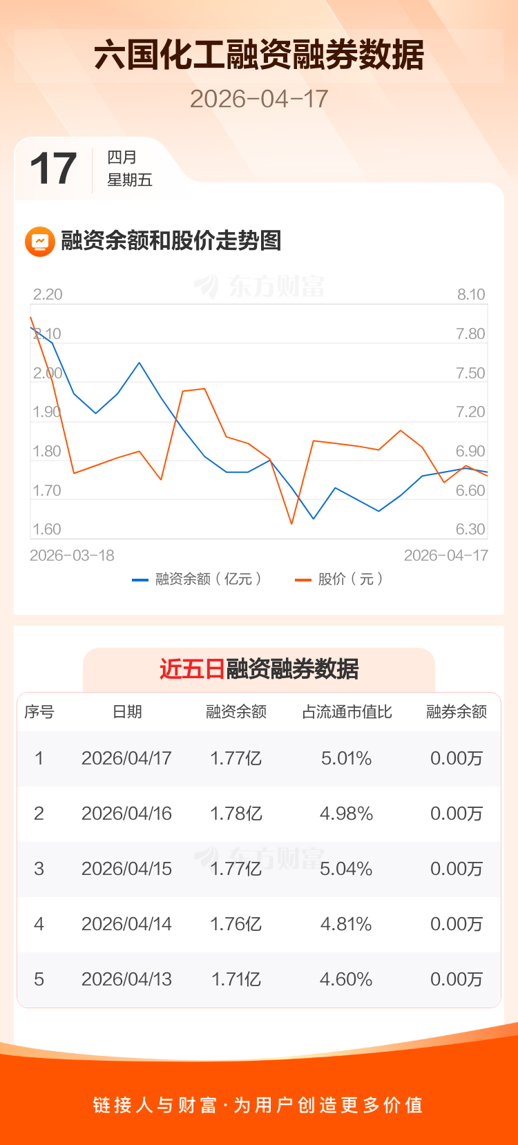交易所最新数据显示,六国化工于2026年4月17日获融资买入1260.28万元,融资偿还1368.31万元,当日融资净偿还108.03万元。目前,该股融资余额1.77亿,占流通市值比例为5.01%。
