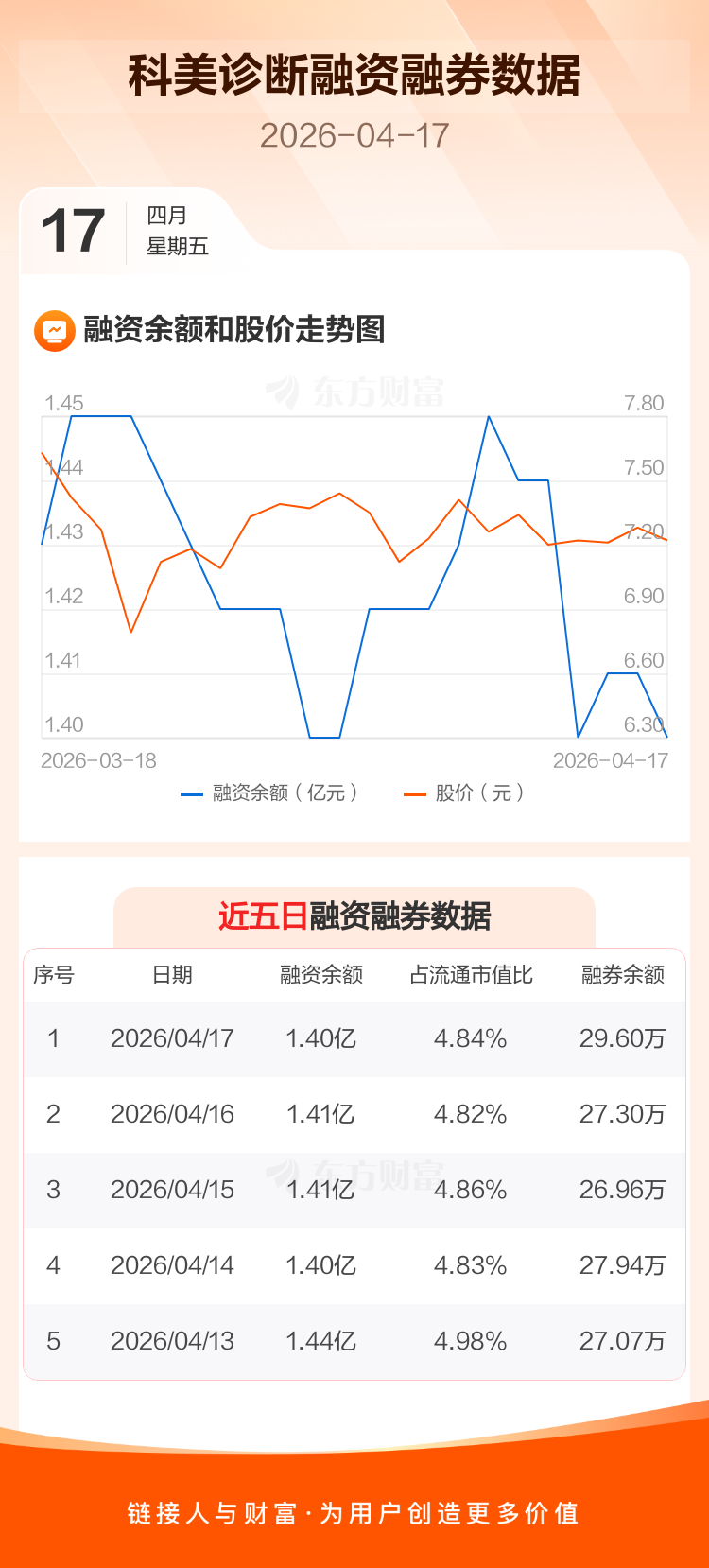 交易所最新数据显示,科美诊断于2026年4月17日获融资买入303.87万元,融资偿还349.13万元,当日融资净偿还45.26万元。目前,该股融资余额1.40亿,占流通市值比例为4.84%。