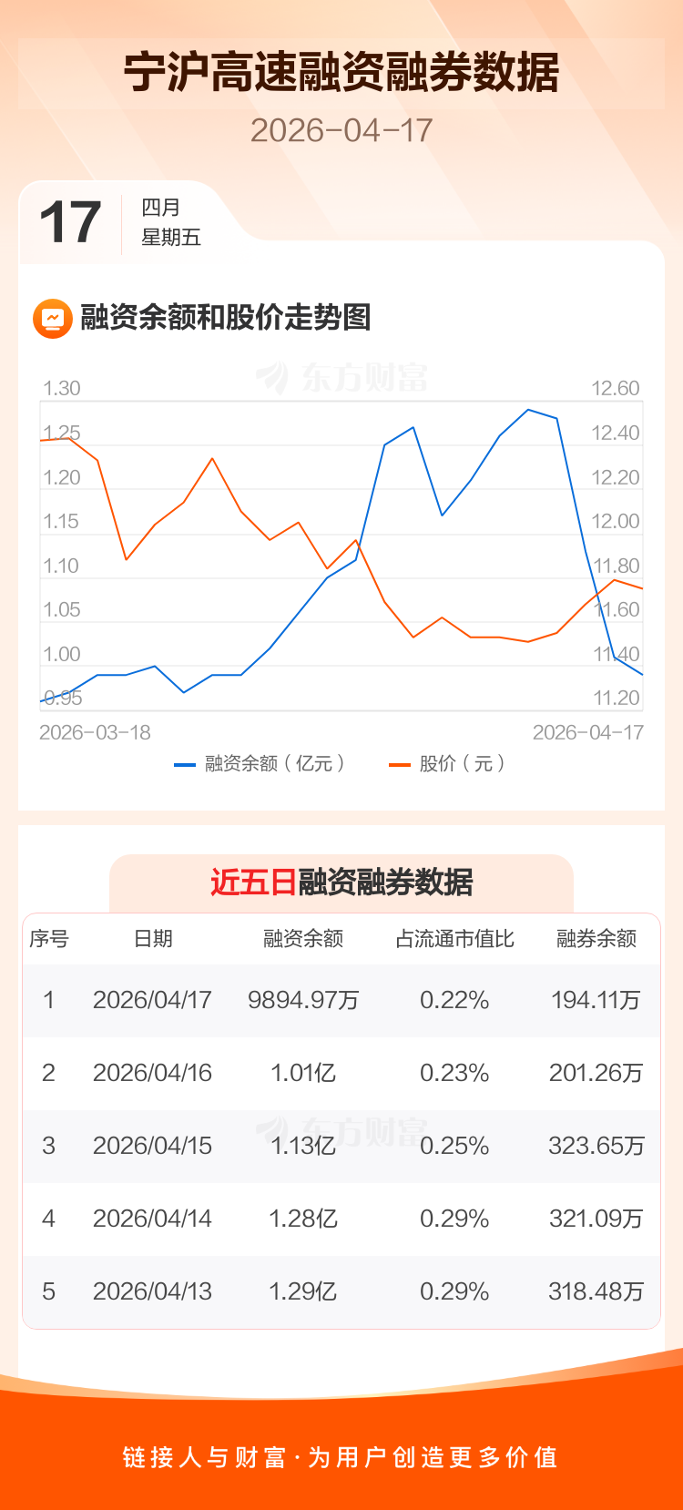 交易所最新数据显示,宁沪高速于2026年4月17日获融资买入39.75万元,融资偿还291.81万元,当日融资净偿还252.06万元。目前,该股融资余额9894.97万,占流通市值比例为0.22%。