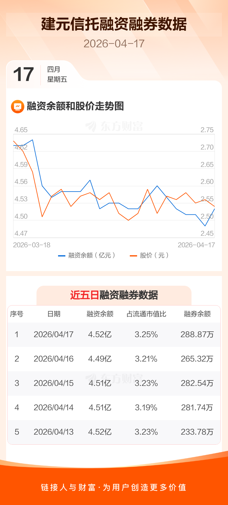 交易所最新数据显示,建元信托于2026年4月17日获融资买入805.39万元,融资偿还539.61万元,当日融资净买入265.78万元。目前,该股融资余额4.52亿,占流通市值比例为3.25%。