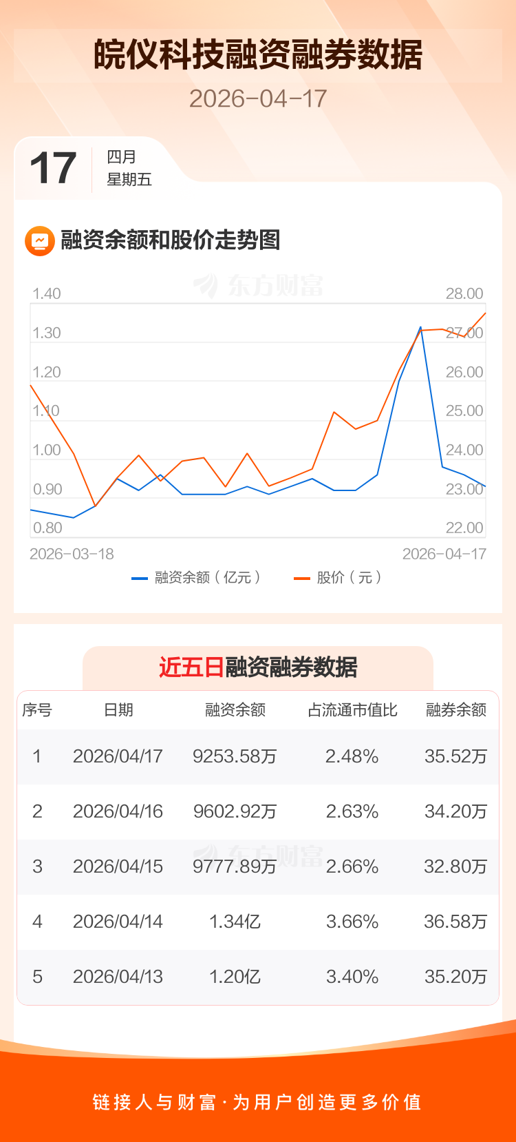 交易所最新数据显示,皖仪科技于2026年4月17日获融资买入1083.89万元,融资偿还1433.23万元,当日融资净偿还349.34万元。目前,该股融资余额9253.58万,占流通市值比例为2.48%。
