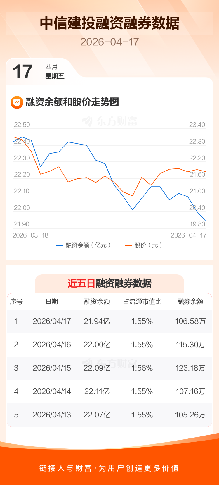 交易所最新数据显示,中信建投于2026年4月17日获融资买入1507.02万元,融资偿还2148.81万元,当日融资净偿还641.78万元。目前,该股融资余额21.94亿,占流通市值比例为1.55%。