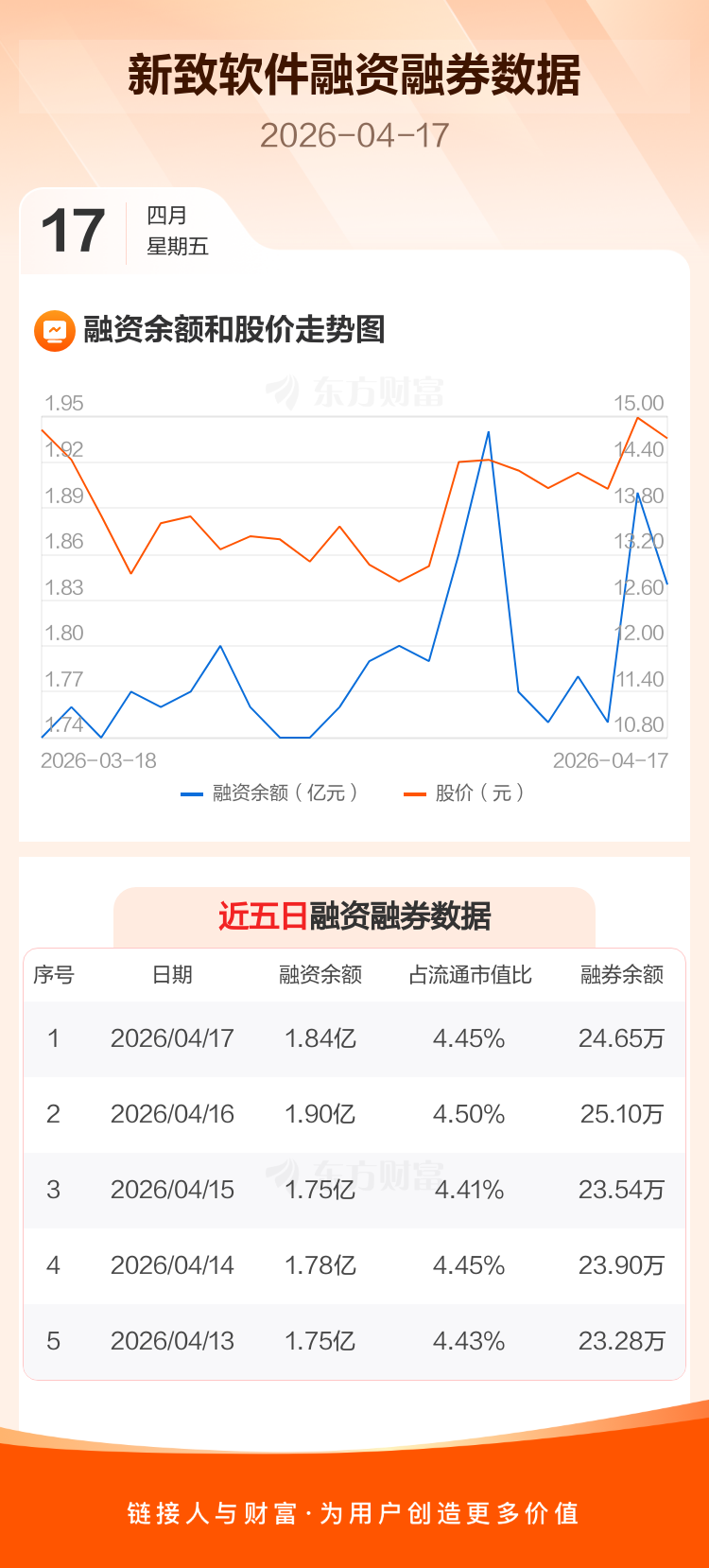 交易所最新数据显示,新致软件于2026年4月17日获融资买入1601.27万元,融资偿还2142.06万元,当日融资净偿还540.8万元。目前,该股融资余额1.84亿,占流通市值比例为4.45%。