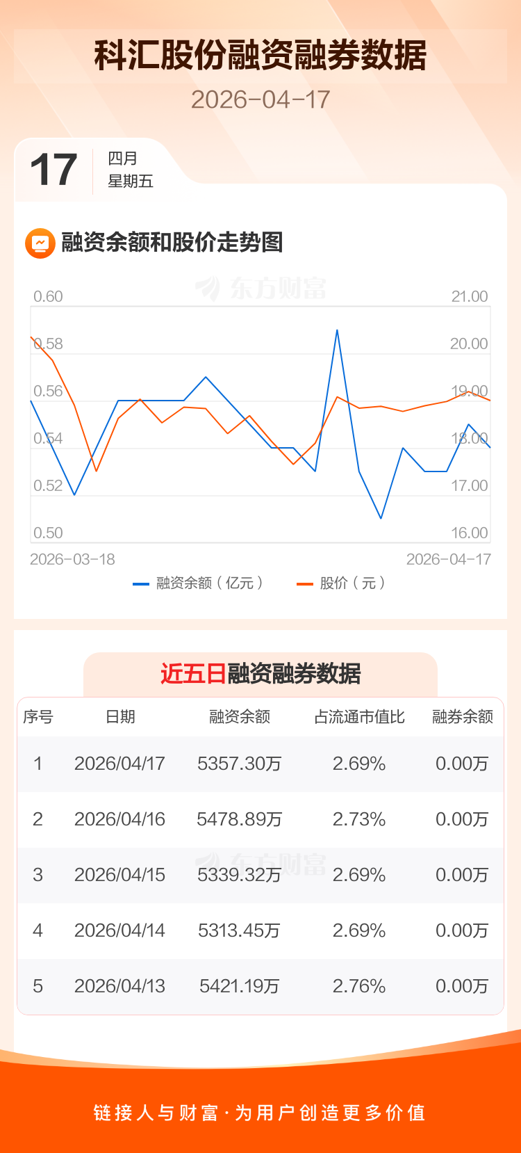 交易所最新数据显示,科汇股份于2026年4月17日获融资买入319.21万元,融资偿还440.80万元,当日融资净偿还121.59万元。目前,该股融资余额5357.30万,占流通市值比例为2.69%。