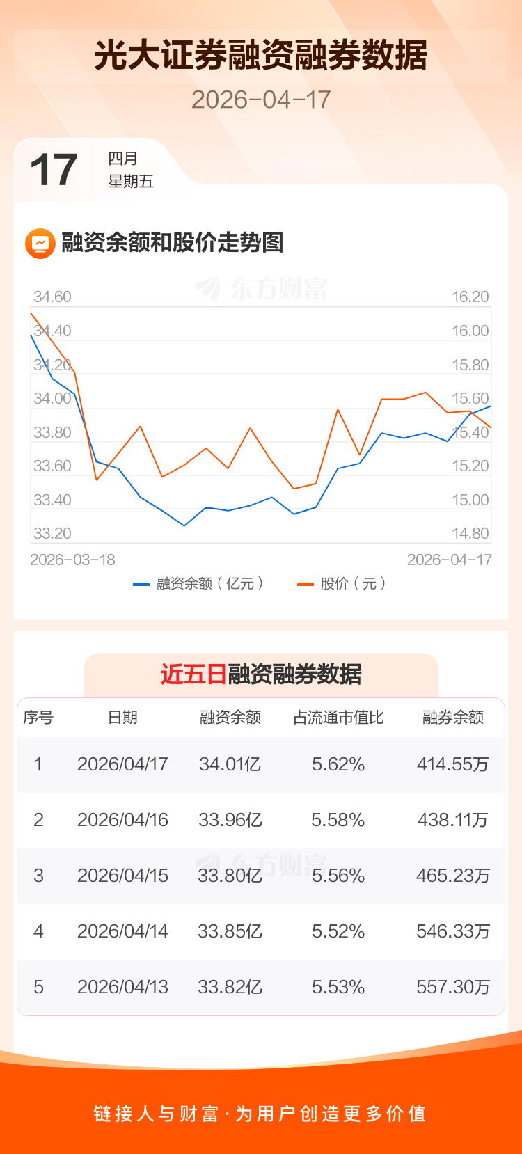 交易所最新数据显示,光大证券于2026年4月17日获融资买入3032.65万元,融资偿还2530.08万元,当日融资净买入502.58万元。目前,该股融资余额34.01亿,占流通市值比例为5.62%。