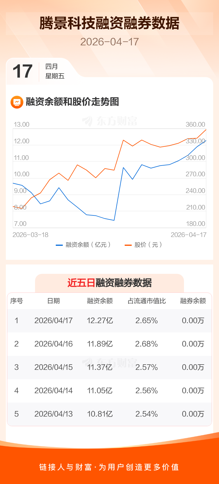 交易所最新数据显示,腾景科技于2026年4月17日获融资买入4.40亿元,融资偿还4.02亿元,当日融资净买入3793.85万元。目前,该股融资余额12.27亿,占流通市值比例为2.65%。