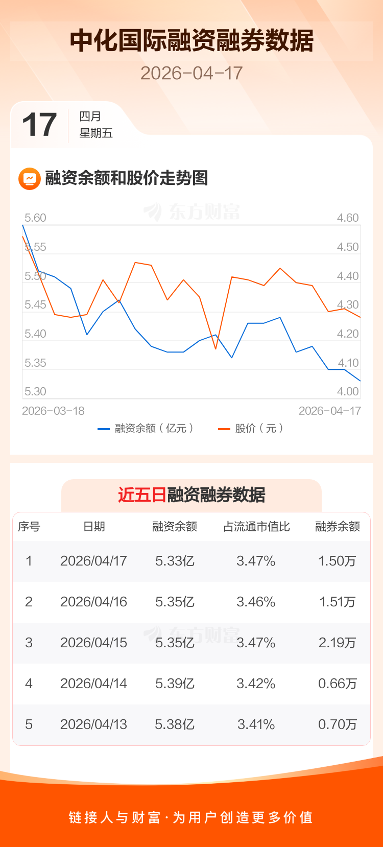 交易所最新数据显示,中化国际于2026年4月17日获融资买入1235.84万元,融资偿还1456.12万元,当日融资净偿还220.28万元。目前,该股融资余额5.33亿,占流通市值比例为3.47%。