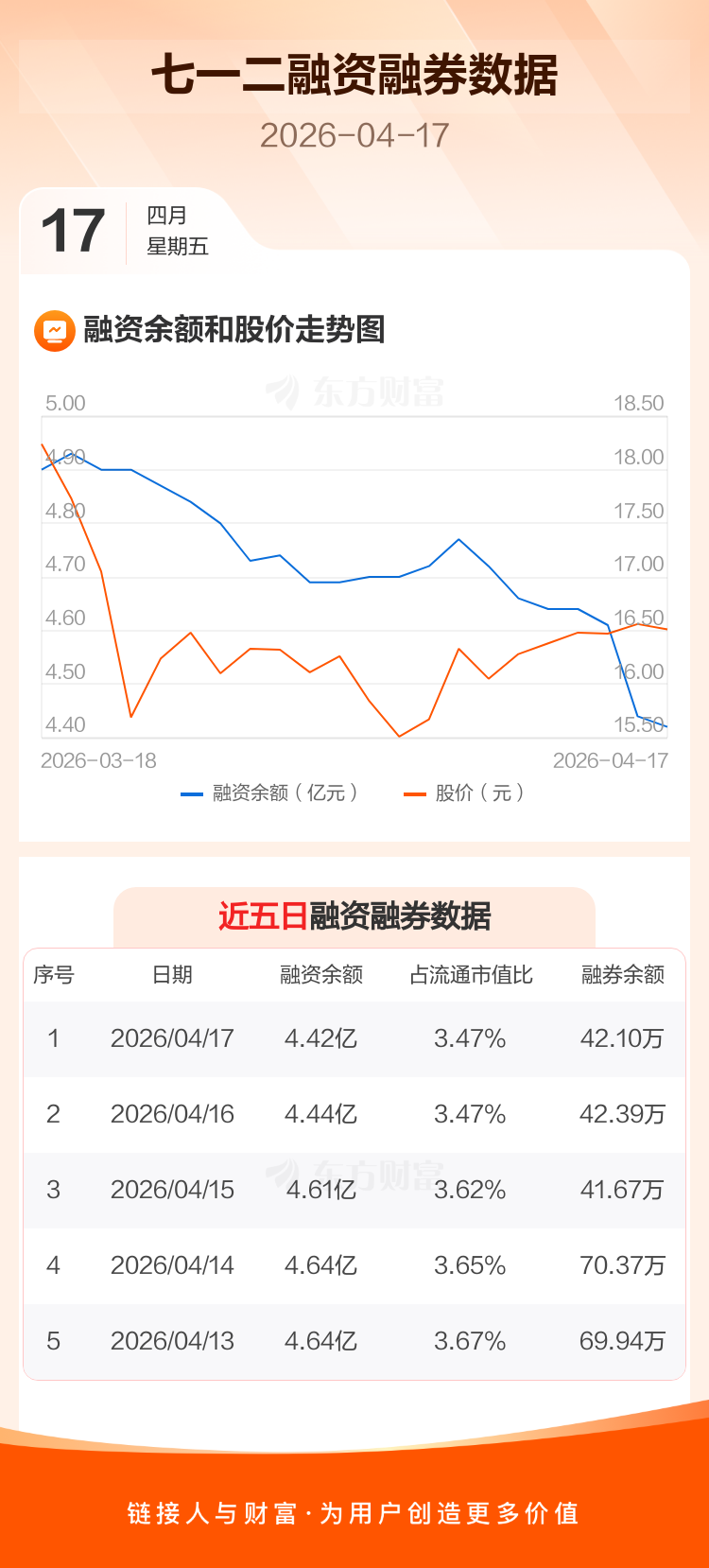 交易所最新数据显示,七一二于2026年4月17日获融资买入662.61万元,融资偿还845.55万元,当日融资净偿还182.94万元。目前,该股融资余额4.42亿,占流通市值比例为3.47%。
