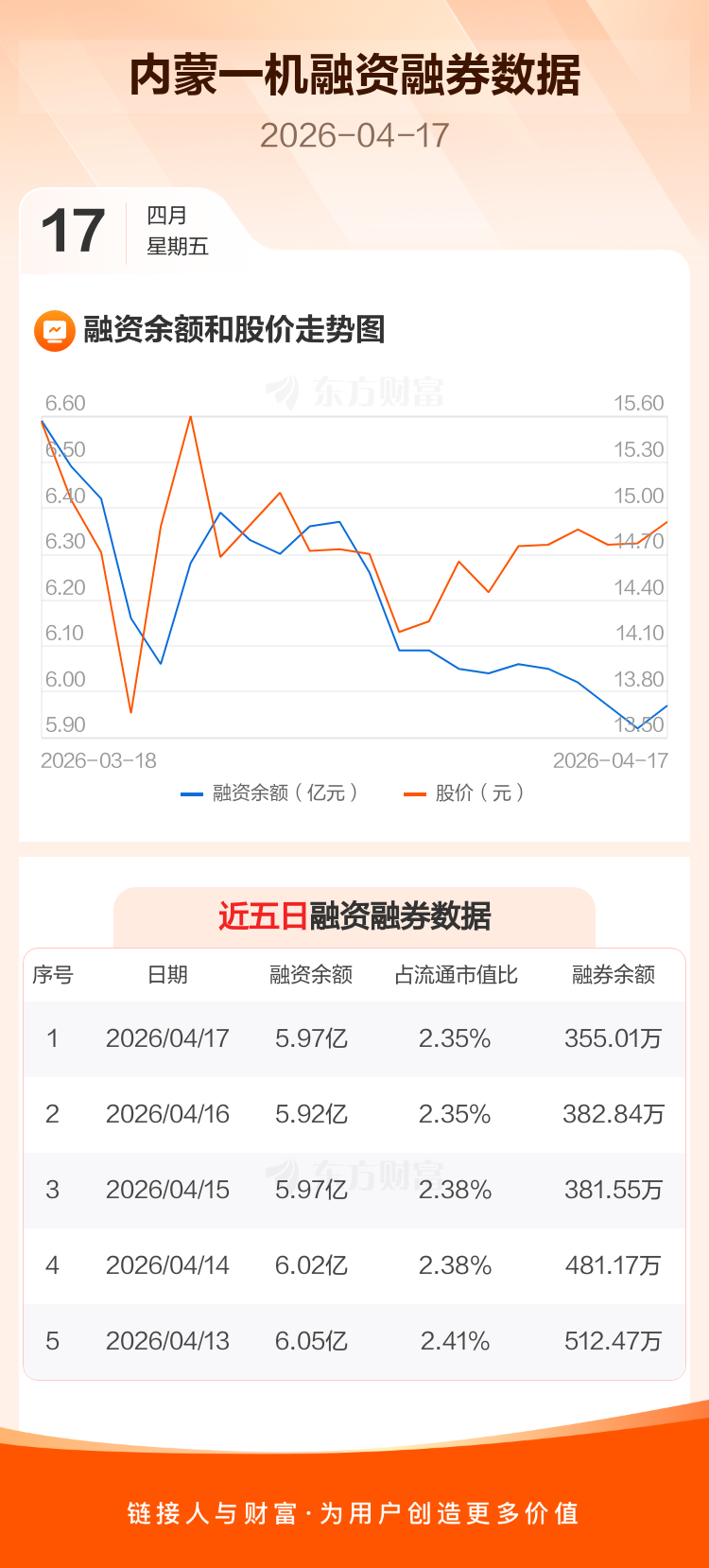 交易所最新数据显示,内蒙一机于2026年4月17日获融资买入3048.78万元,融资偿还2487.80万元,当日融资净买入560.98万元。目前,该股融资余额5.97亿,占流通市值比例为2.35%。