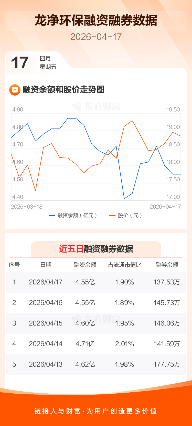 交易所最新数据显示,龙净环保于2026年4月17日获融资买入1758.68万元,融资偿还1781.18万元,当日融资净偿还22.5万元。目前,该股融资余额4.55亿,占流通市值比例为1.90%。