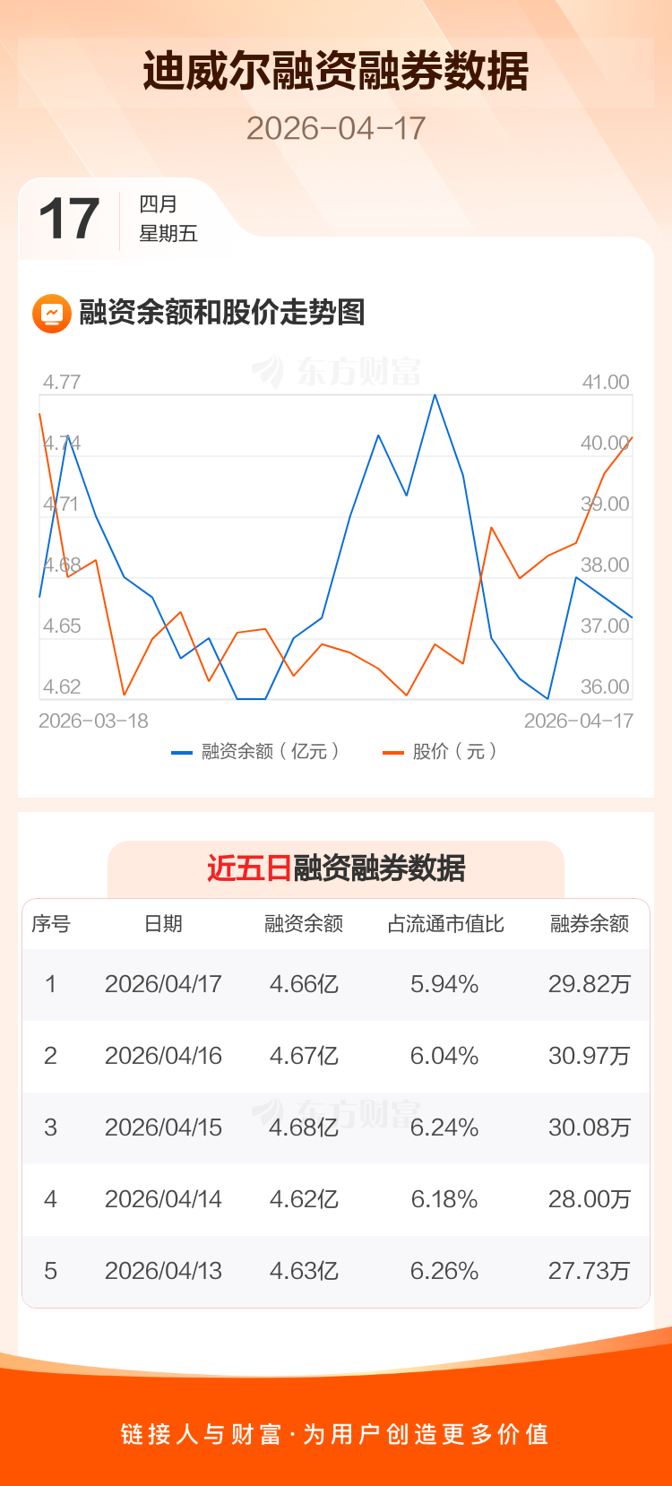 交易所最新数据显示,迪威尔于2026年4月17日获融资买入354.39万元,融资偿还422.73万元,当日融资净偿还68.34万元。目前,该股融资余额4.66亿,占流通市值比例为5.94%。