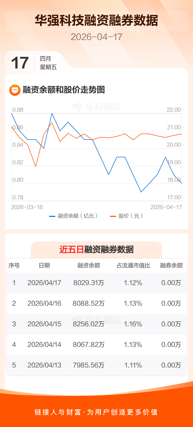 交易所最新数据显示,华强科技于2026年4月17日获融资买入348.85万元,融资偿还408.06万元,当日融资净偿还59.21万元。目前,该股融资余额8029.31万,占流通市值比例为1.12%。