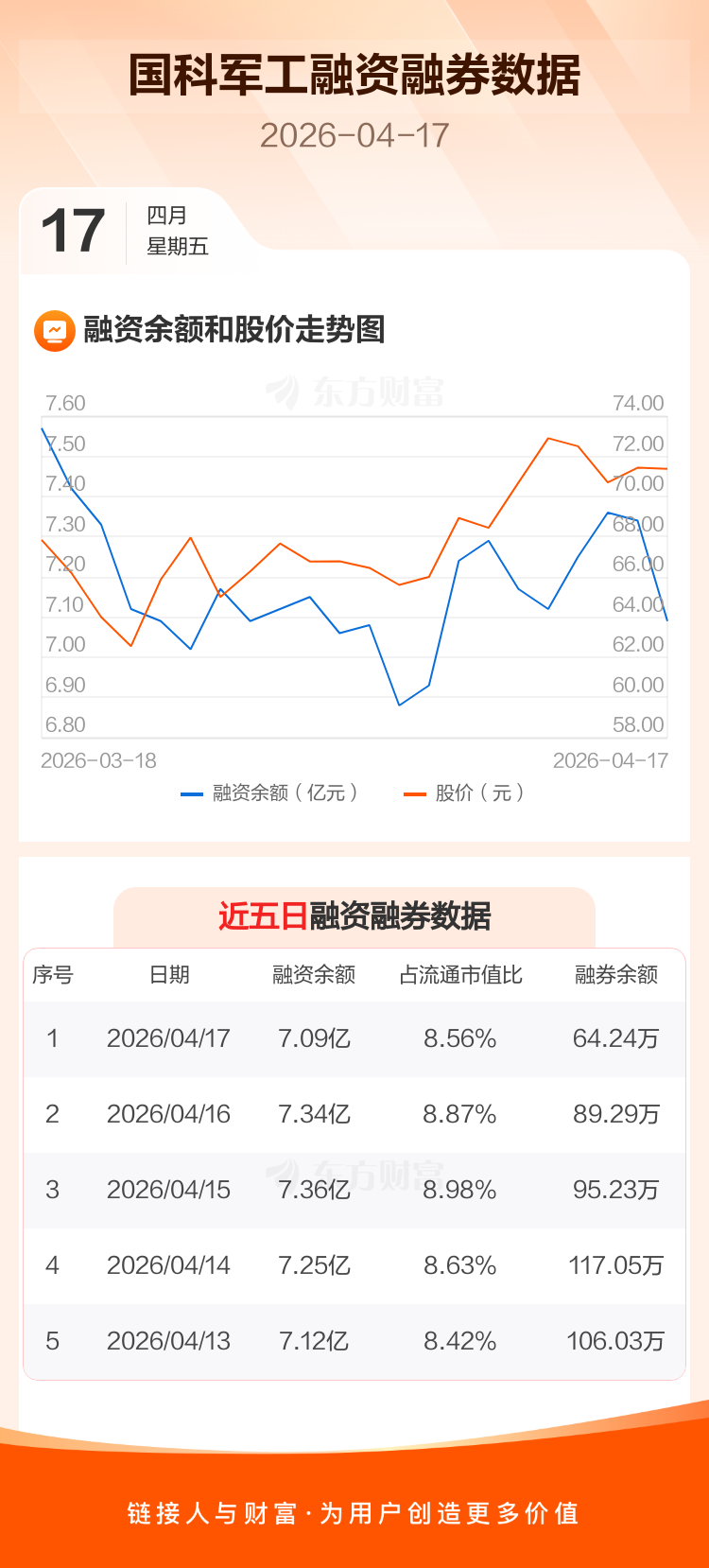 交易所最新数据显示,国科军工于2026年4月17日获融资买入3598.94万元,融资偿还6153.86万元,当日融资净偿还2554.92万元。目前,该股融资余额7.09亿,占流通市值比例为8.56%。