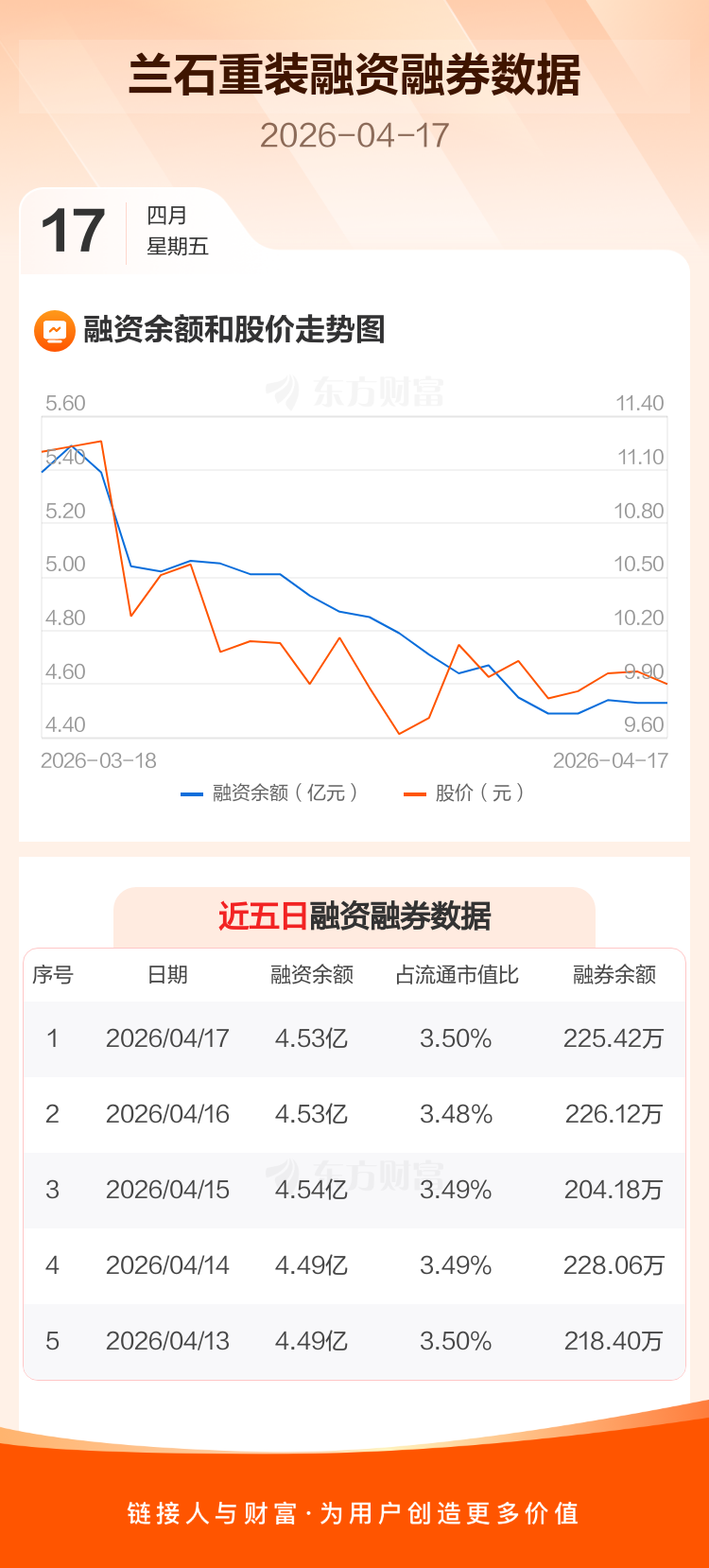 交易所最新数据显示,兰石重装于2026年4月17日获融资买入1346.03万元,融资偿还1346.45万元,当日融资净偿还4214元。目前,该股融资余额4.53亿,占流通市值比例为3.50%。